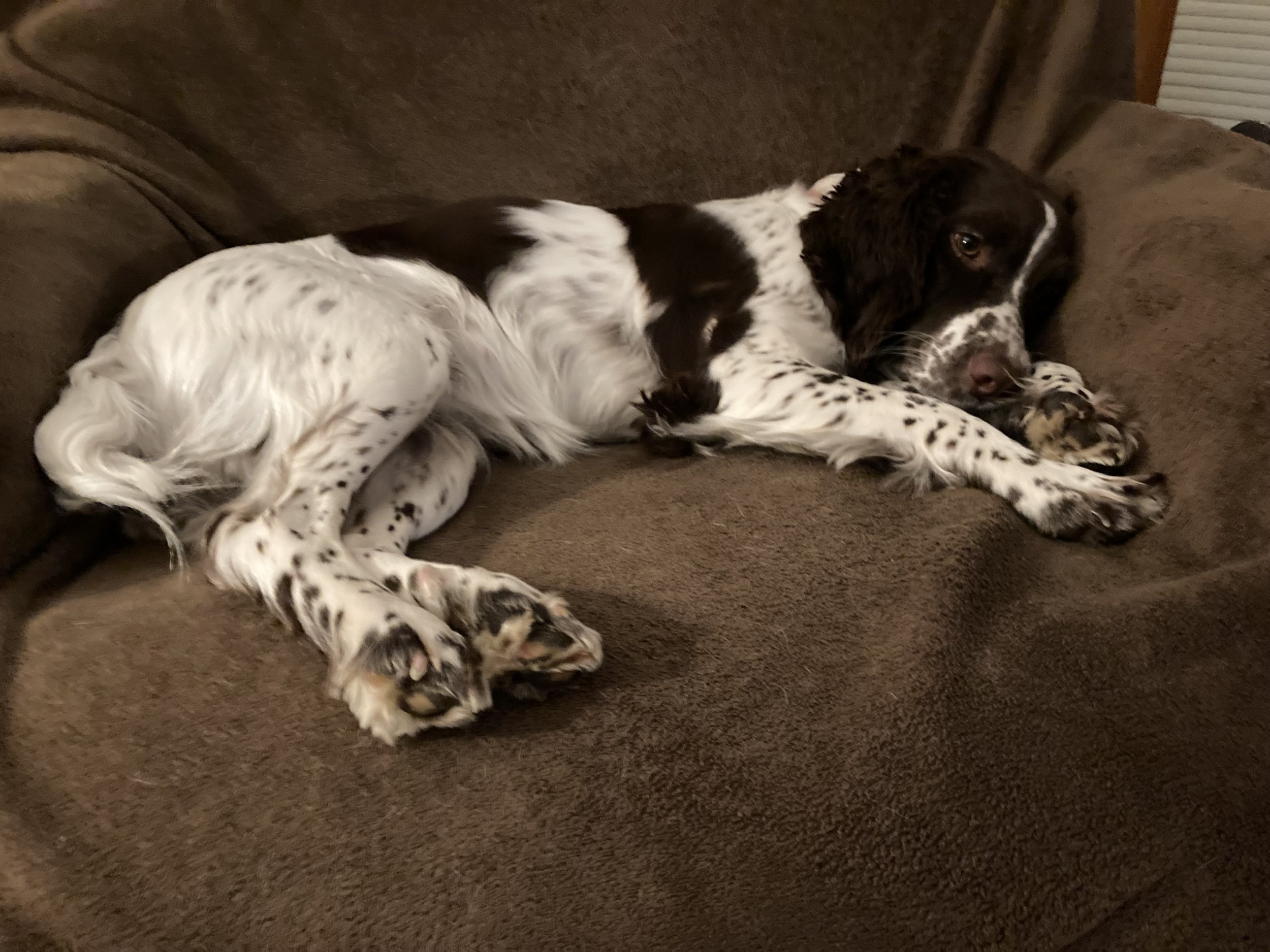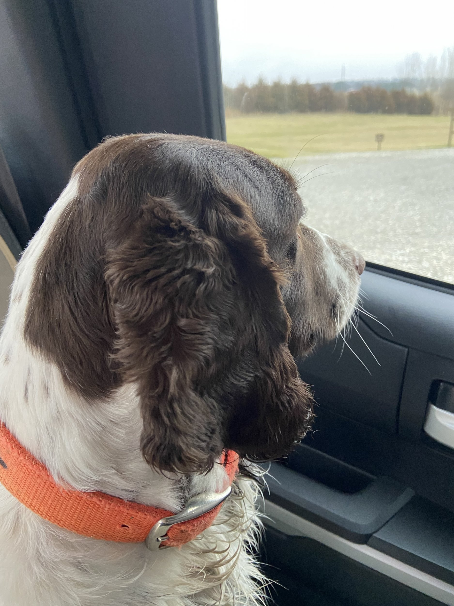 This is my sweetheart watching me through the windows of a building I was in and waiting for me to come out. I'll peek out and she never takes her eyes off the door till I come out. She's a 37 lb full grown field Springer Spaniel. What a dog.
