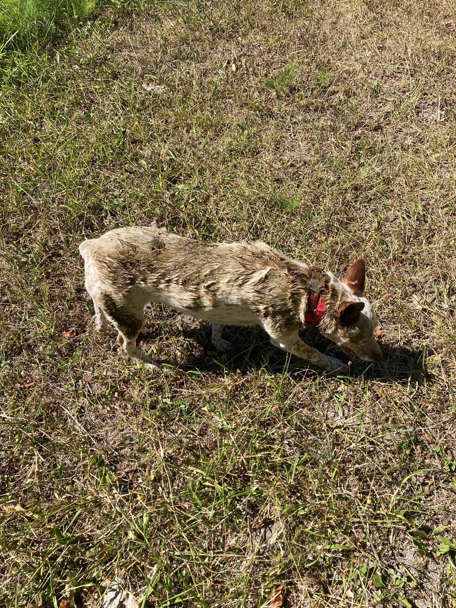 My last dog used to find the freshest, wettest, smelliest pile of moose dung and roll in it so that the right side of her neck was covered... then would walk up and rub against me so that I would reach down and pet her there. I swear that she did it just to make me go "Ewww!!"Here is what one of mine looks like after doing that rolling thing in a cow pasture. She finds the fresh stuff before I have any idea what she is up to.