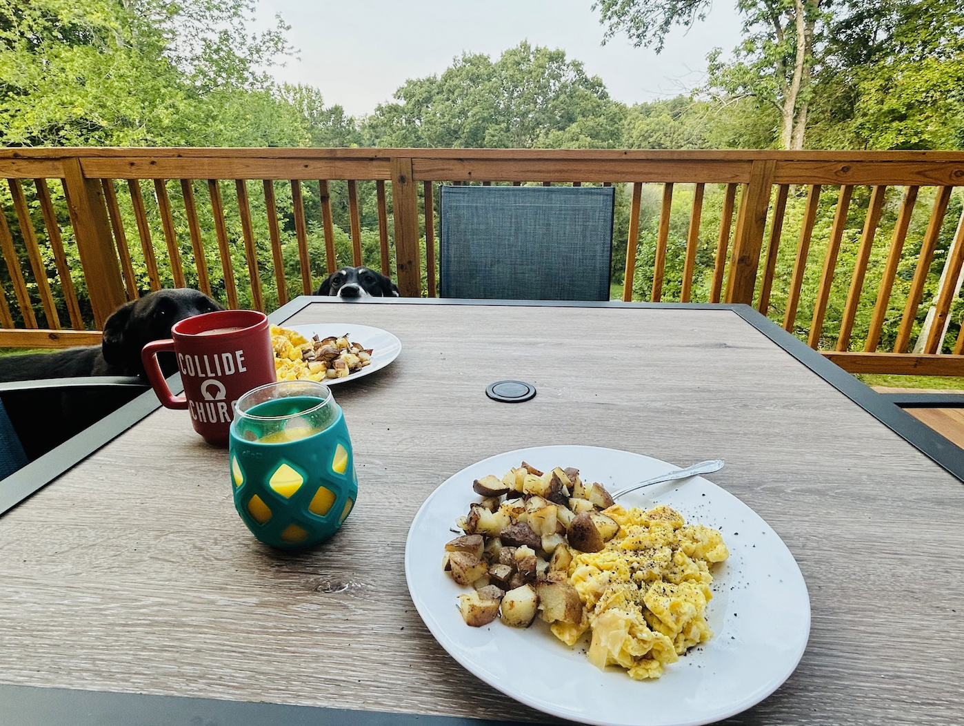 Last night was one of the first times we ate on our new back deck. Breakfast for dinner you could say.