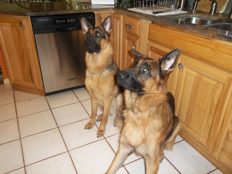 Thanks, they are GSDs. The male is 100% DDR and the female is Czech. We do feed raw (chicken quarters usually) and it is great, expensive but great. The stool never stinks, disintegrates within a few days and won't stick to your shoes if stepped on. And the dogs stay very healthy. We also don't vaccinate and have never had a problem.