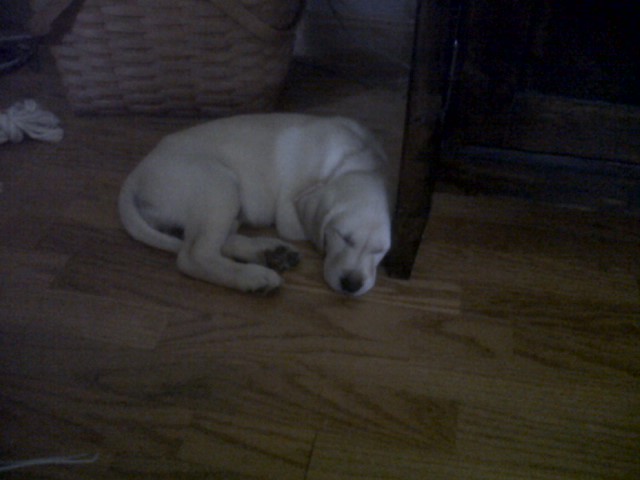 This is our new yellow lab pup. We got her last week from friends. Our 7 y/o dog is finally starting to like her and play with her. Our 7 y/o has been kinda down since we lost our 12y/o dog last month, the new pup seems to be helping that. Puppies are so fun to watch.
