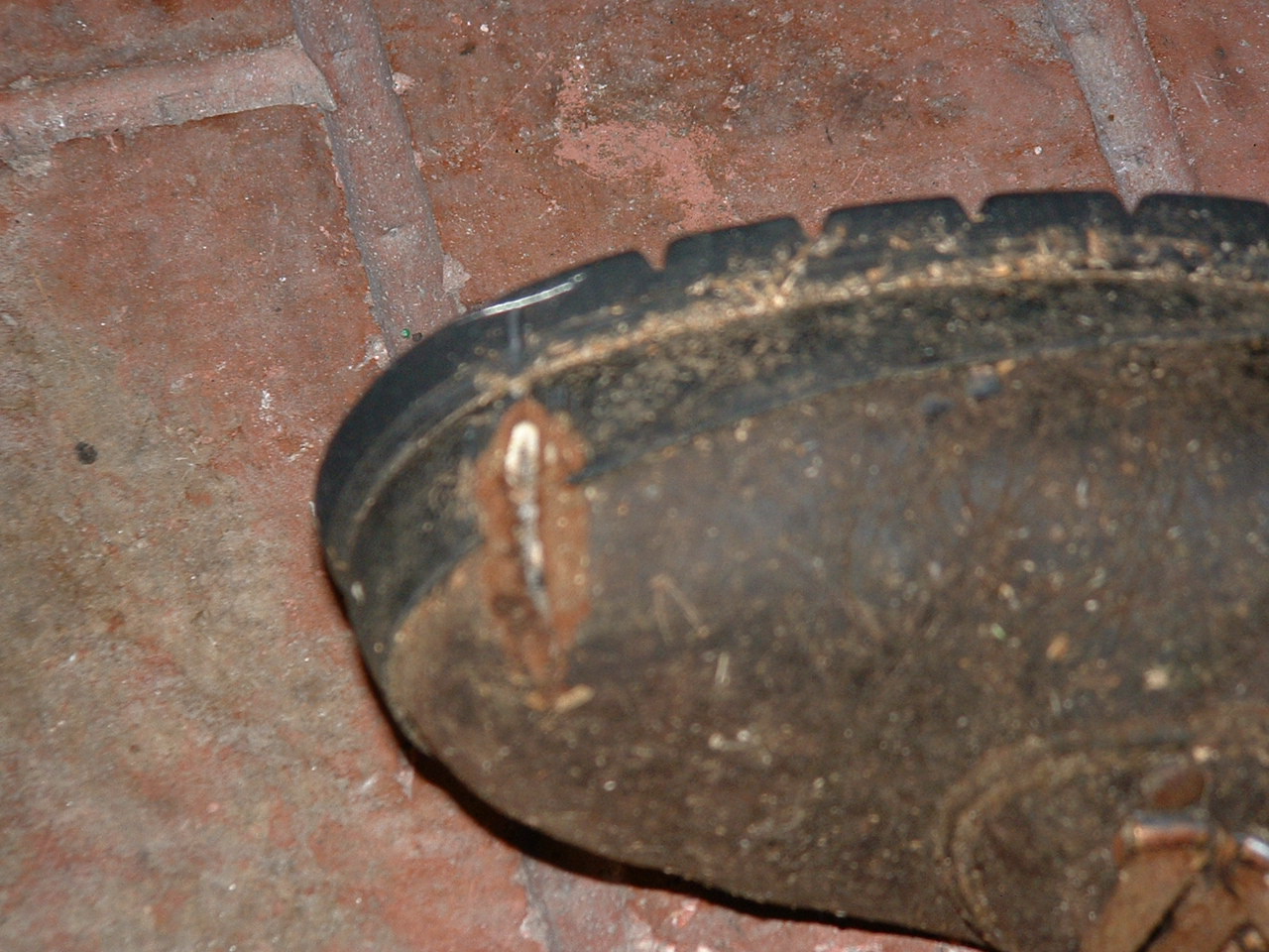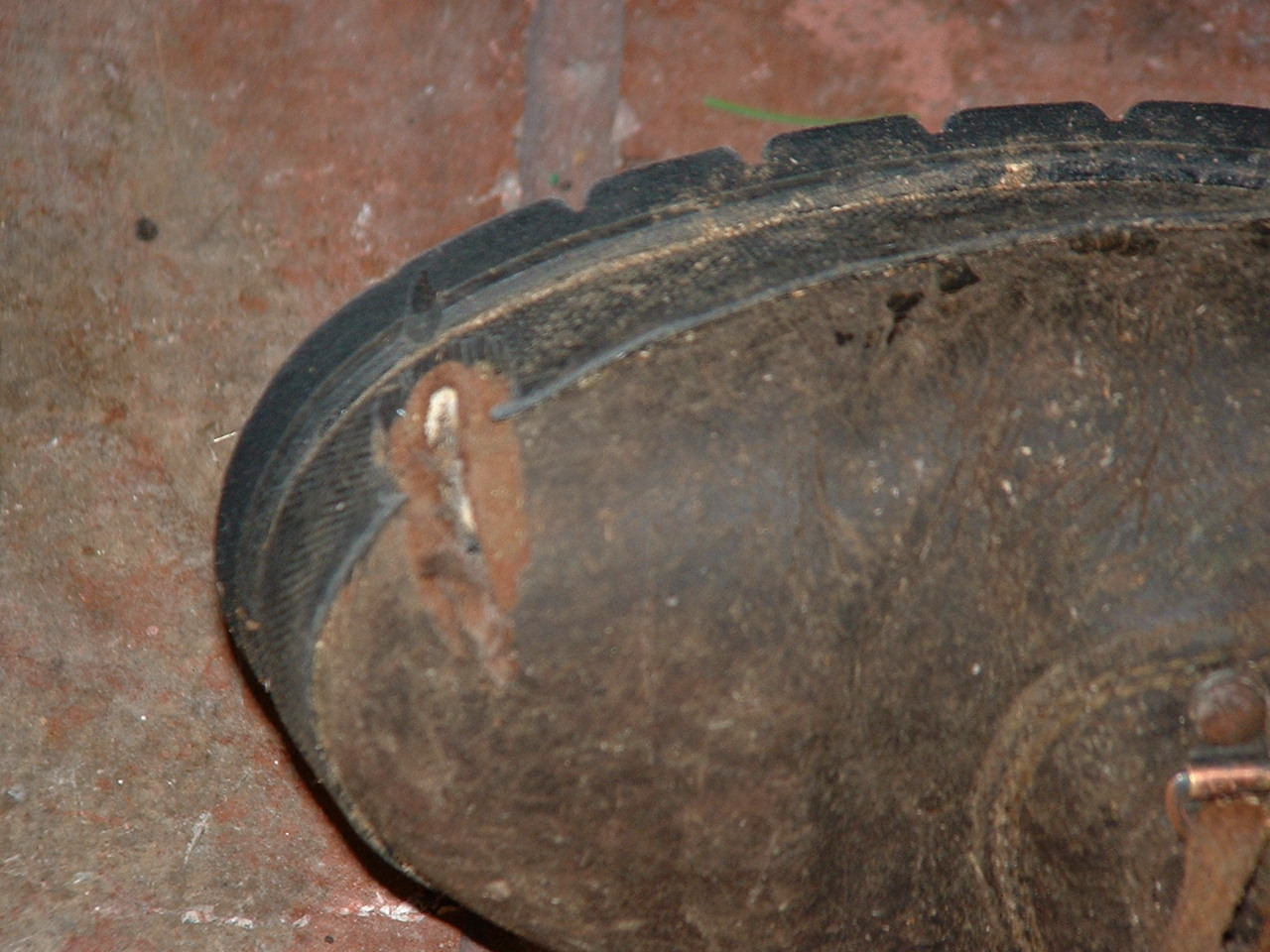 Just thought I would tattle on myself. Working about 20' up in a wild cherry clearing branches over some power lines. I needed to cut a lower branch near where I was standing so I reached down with the chainsaw to cut the branch. I knew I was near my foot but was trying to be careful. I felt the vibration of the saw but just thought it was the engine resting on my boot. Then I decided I better make sure. Fortunately these are thick boots. Not steel toed. Anyway a couple of pictures. It just cut through the leather and part of the inside toe cover. Not into socks or flesh thank God. Then I was playing on You-tube and found this link.