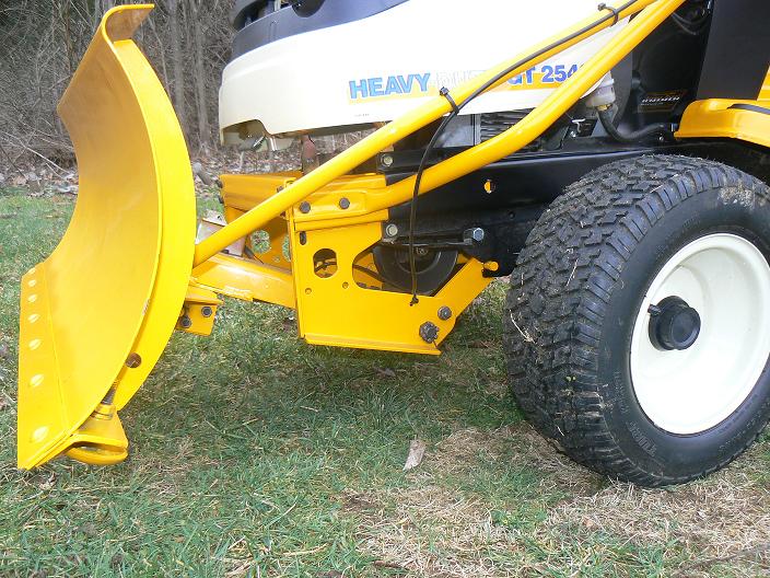 "I used the blade yesterday to spread about 4 yards of gravel over my lower driveway. It went much better than I expected, and the blade didn't trip under the load. I later tested the blade against a protruding rock to make sure it would trip when appropriate, and it did. No damage other than a very small scratch (I went really slow). The blade is very stout, much thicker than the blade for the 1000/1500's. Plus it has those reinforcing ribs on the back. Raising and lowering both require only a little effort. I raised and lowered the blade probably 40+ times while spreading the gravel, and it didn't tire me out at all. swinging the blade left to right was effortless as well. Presumably that'll be dependant on how well the pivot point stays lubricated. Below are pictures showing some detail of the blade."
