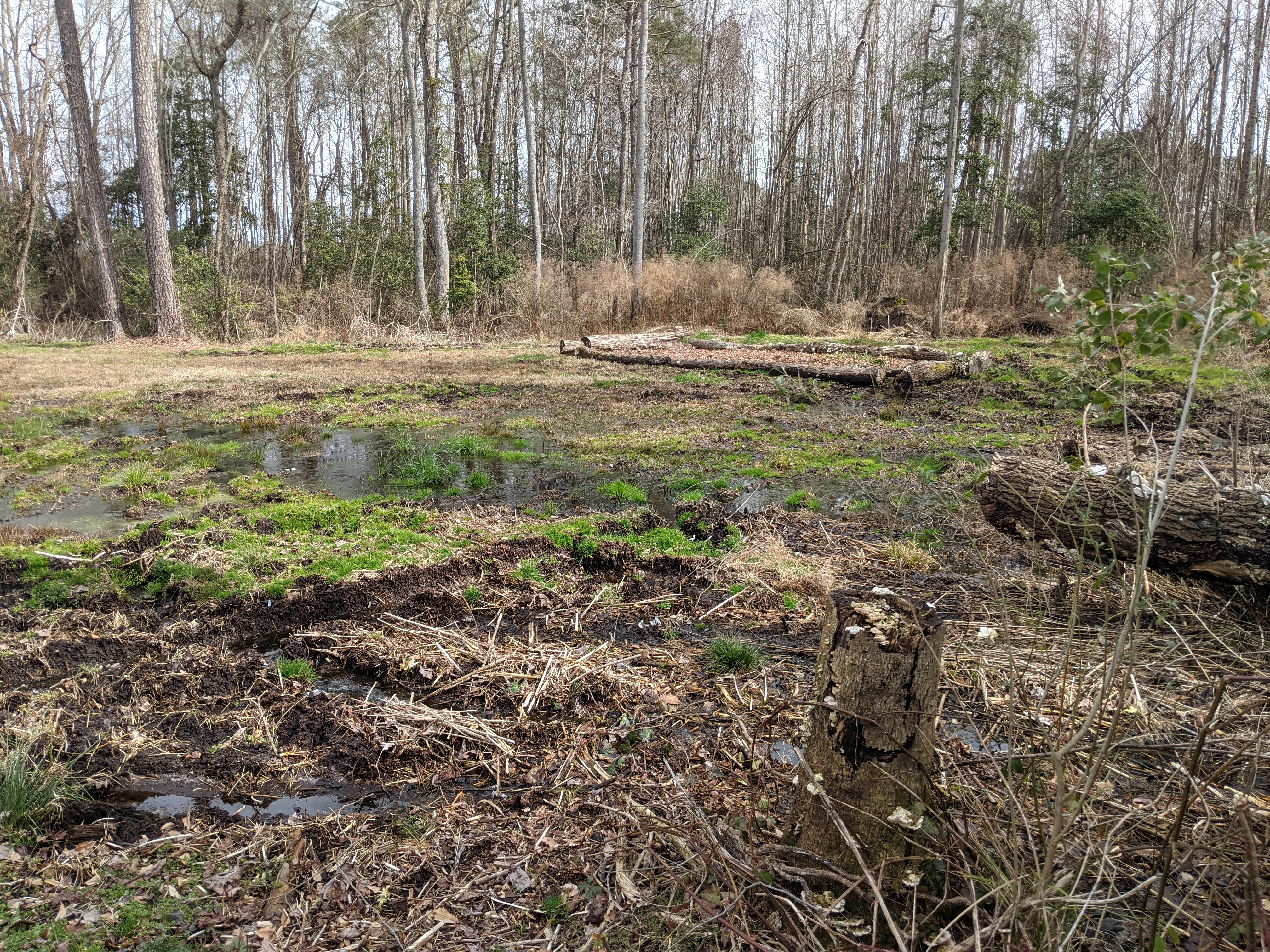 Thank you everyone for the input, lots of good information. I think my best course of action will be to let it dry as suggested, and then I'll come through with a sub soiler to improve the compaction issue. Finally I'll dig another trench down to the creek and run a tile drain like in that video. The creek isn't big enough to worry about flooding my house, it's more of a swampy stream a few inches deep and this is at the wettest part of the year.
