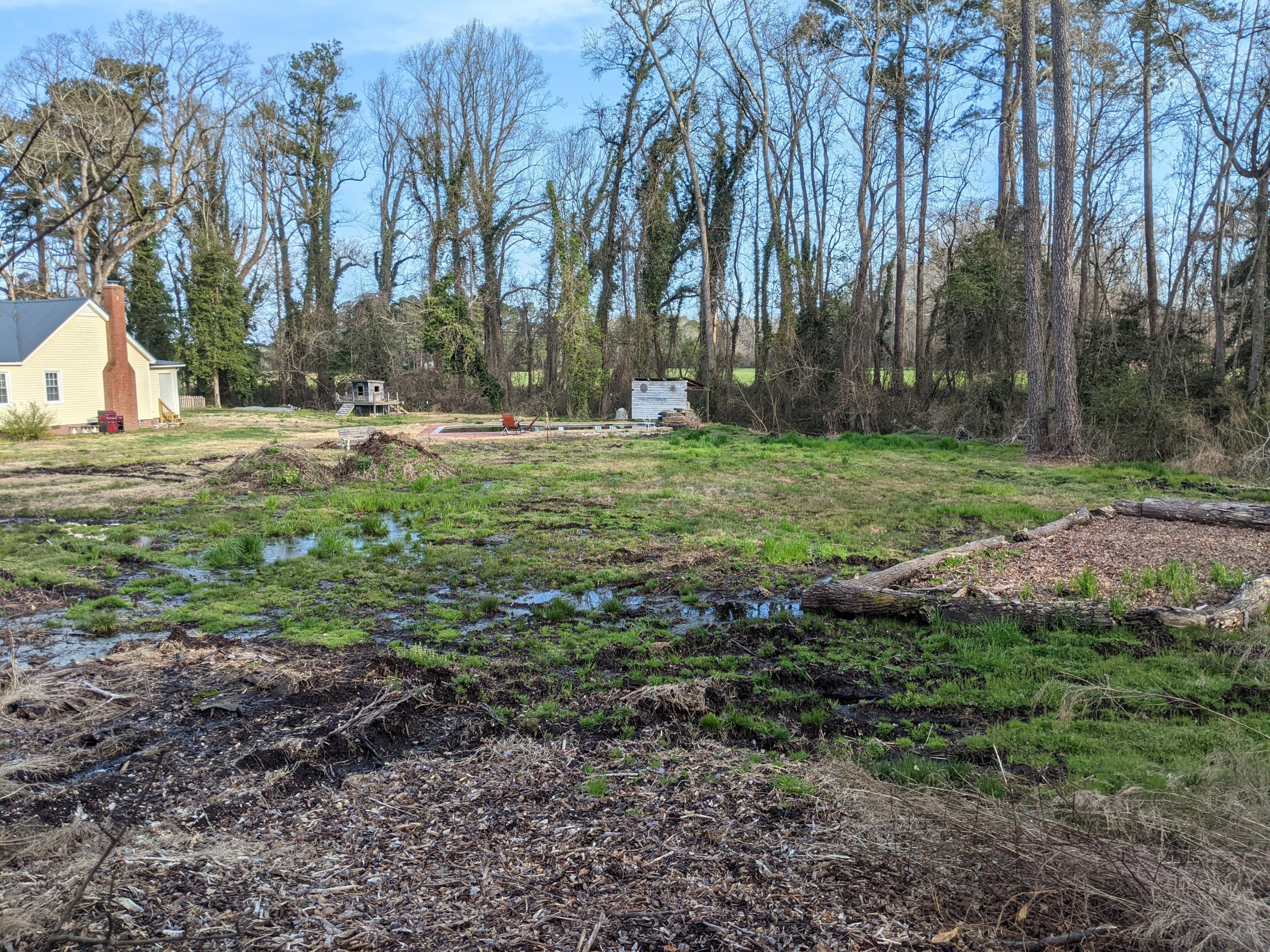 My entire backyard has had standing water since I moved into my house in December. I suspect it's primarily due to compaction, as the previous owners had a good 15+ trees cut down back there. The standing water seems to be in all the ruts created by the tree trucks. Fortunately for me, they left all of the logs stacked on the edge of the yard. Unfortunately, they're far too big for a chipper.