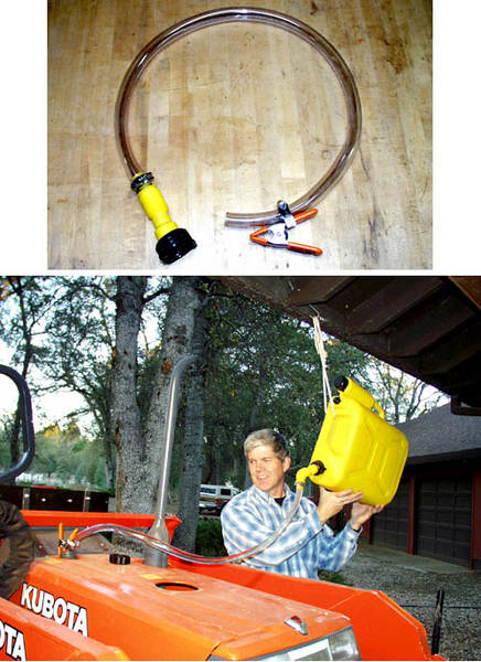 The tractor is my ONLY diesel fuel user, and I only operate it mostly on weekends, so I actually am running fuel preservative within the 5 gallon can and the tractor fuel tank. What I am trying to say here is that a 100 gallon or larger, high-mounted permanent fuel tank with gravity feed is not really an attractive solution when you use only a few gallons per weekend, and you really don't want to spend hundreds of dollars AND have the fuel get stale.