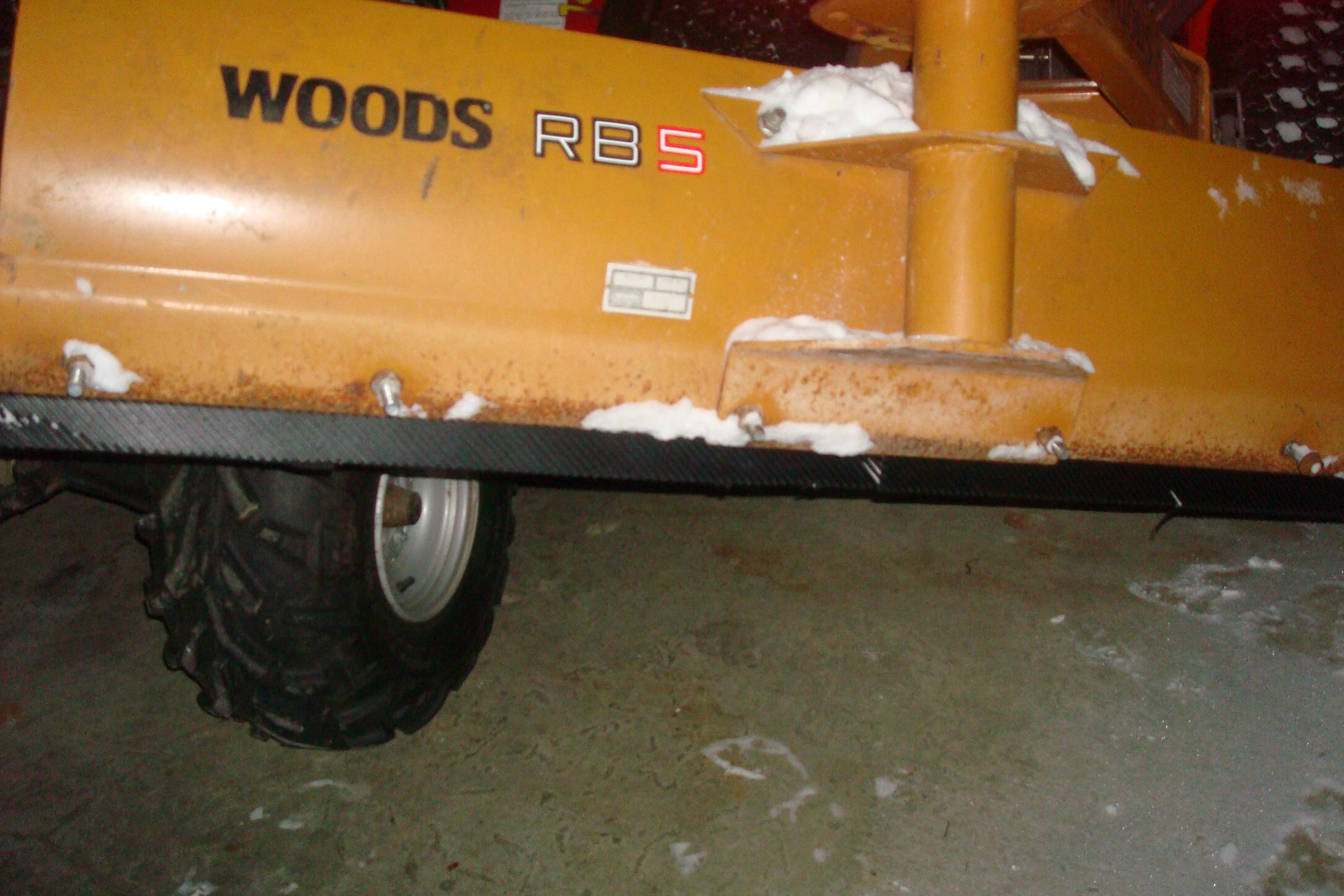 I got interested in doing the squeegee thing to my new 7' rear blade after reading this thread, but couldn't find any substantial belting at the local TSC, so I gave up and went home. That afternoon, The Plant Manager asked me to move the old tires up in the loft over the garage down so we could put them out for trash pick up. I said "are any of them big"? She said "yes, ones pretty big". So I drug down the tires to the street, except for the big one, which measured about 30" in diameter. Cut the sidewalls off with a reciprocating saw and slit the resulting loop of tread to get an 8x80" strip of 1/2" thick rubber. Took the cutting edge off the back blade and used it as a template to locate the bolt holes with a marking crayon. Drilled eight 5/8" holes through at the marks with Grampa's old brace & bit then ran out to the hardware store for 8 5/8-11 2" grade 8 plow bolts. Made it before they closed. Bolted everything back up and it looks great.