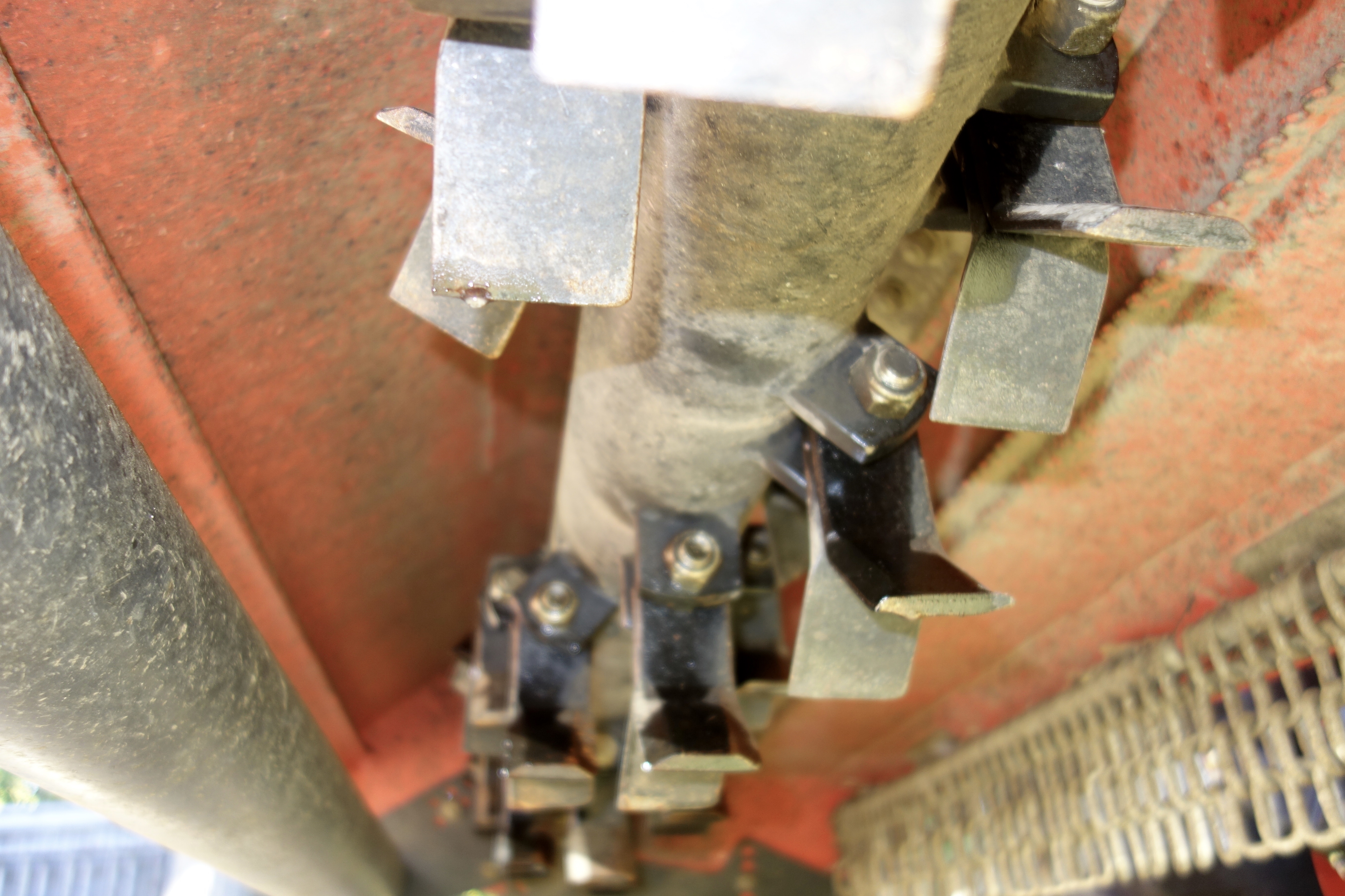 I picked up an EFGC155 as part of a package not knowing anything about flails. It's 60" wide and the manual is generic so not reliable on details. I posted a general description earlier. I pulled the y knives to put an edge on them. There were 23 sets hung from brackets welded to a 4.25 inch rotor. The brackets were arranged in a spiral that allowed knives to overlap around an inch. The knives hung about 5 inches from the rotor and were .25 inch thick and 1 7/8 inch wide -so very heavy. But mild steel with double bevels. Edges were factory blunt about 3/16 inch and on the cutting side rounded. I pulled the knives to inspect and sharpen. One knife was slightly bent hitting a hidden stump and a couple had small chips where rocks got in the way. I set the knives to hang 2 to 3 inches from ground and usually set my top link on long side to reduce ground contact. I decided the fastest way to put an edge on the knives was to use my belt sander with 36 grit. The process was to first to flatten the bottom and second to put a secondary bevel on the factory bevel. I touched up the bevel with a double cut bastard. Here are a couple of pictures of the knives. The picture of knives hanging show the rotor with hangers arranged in a spiral. The knives in the second photo show factory edges after use (right side), edges belt sanded middle and edges after hand filing.