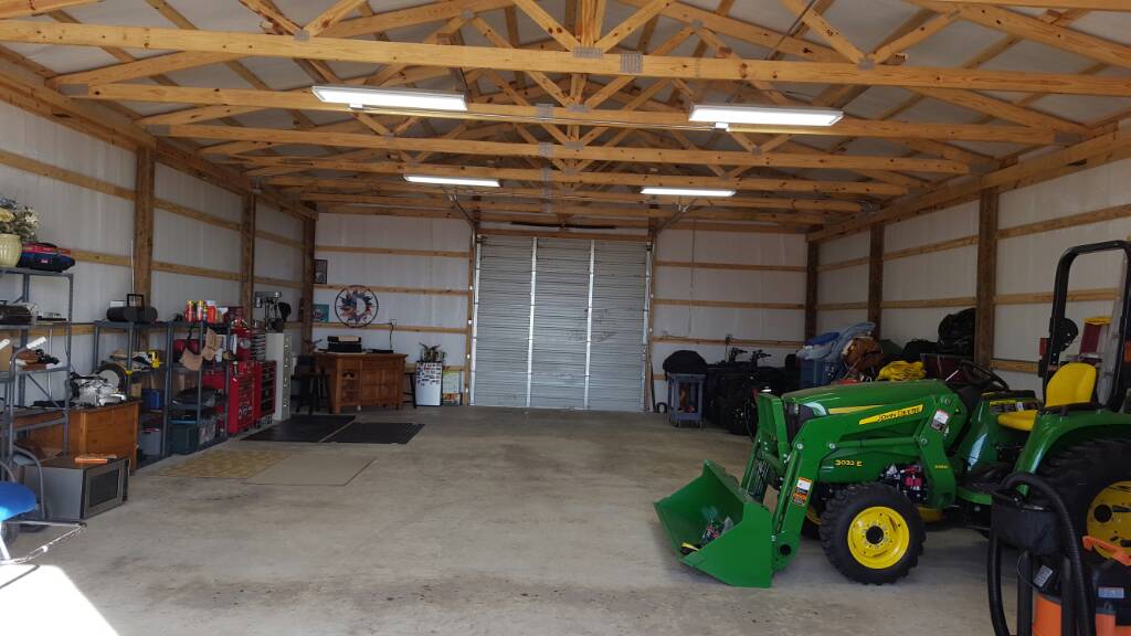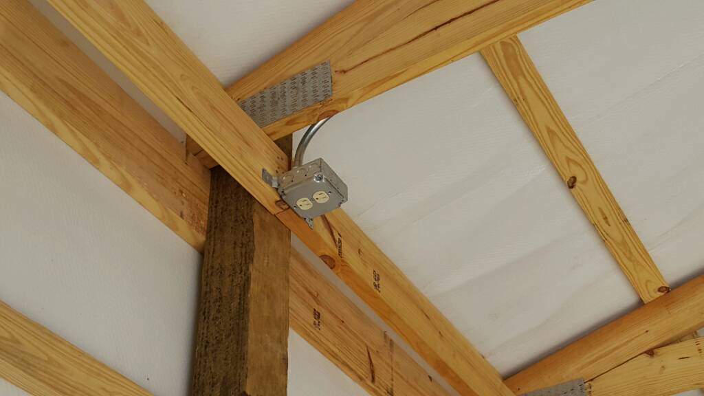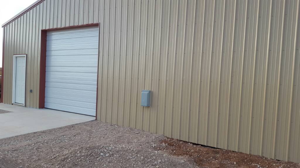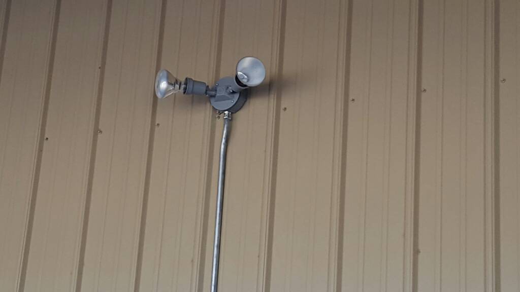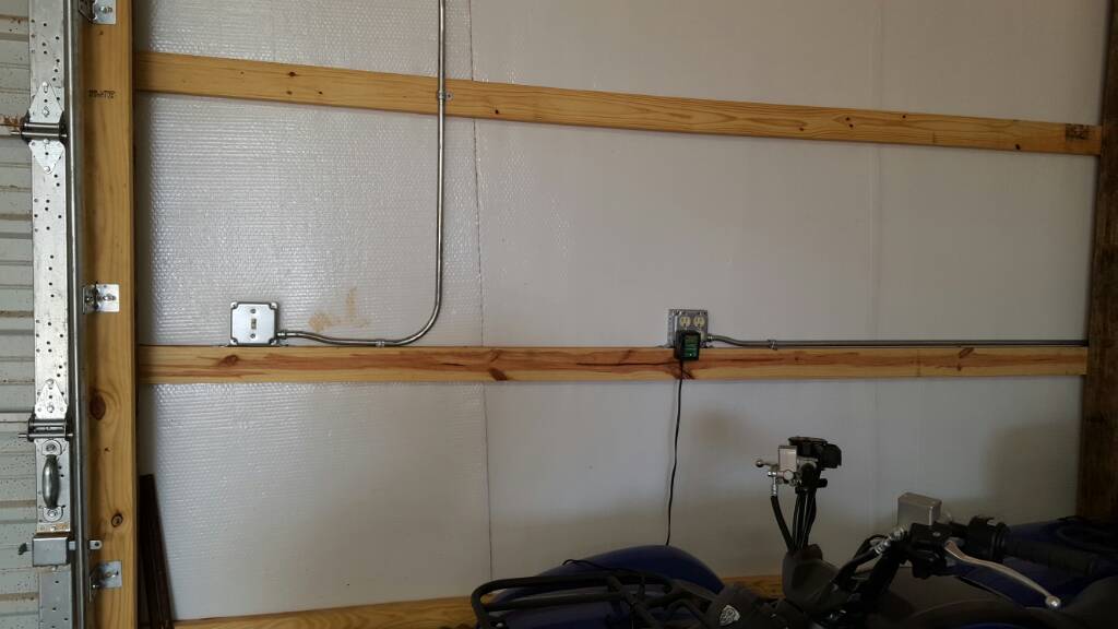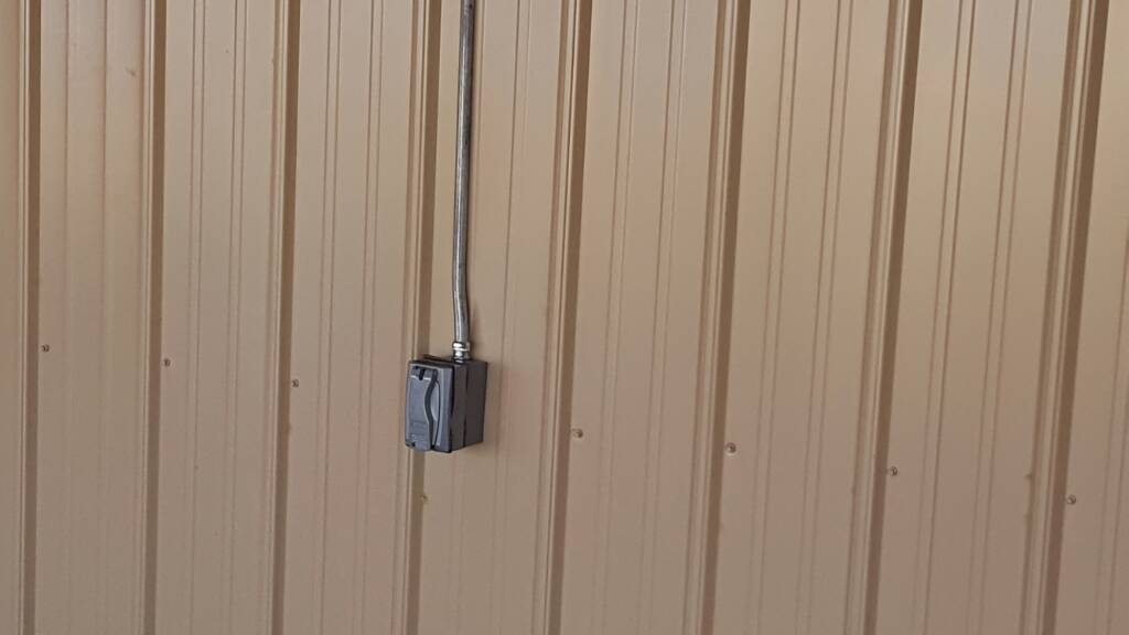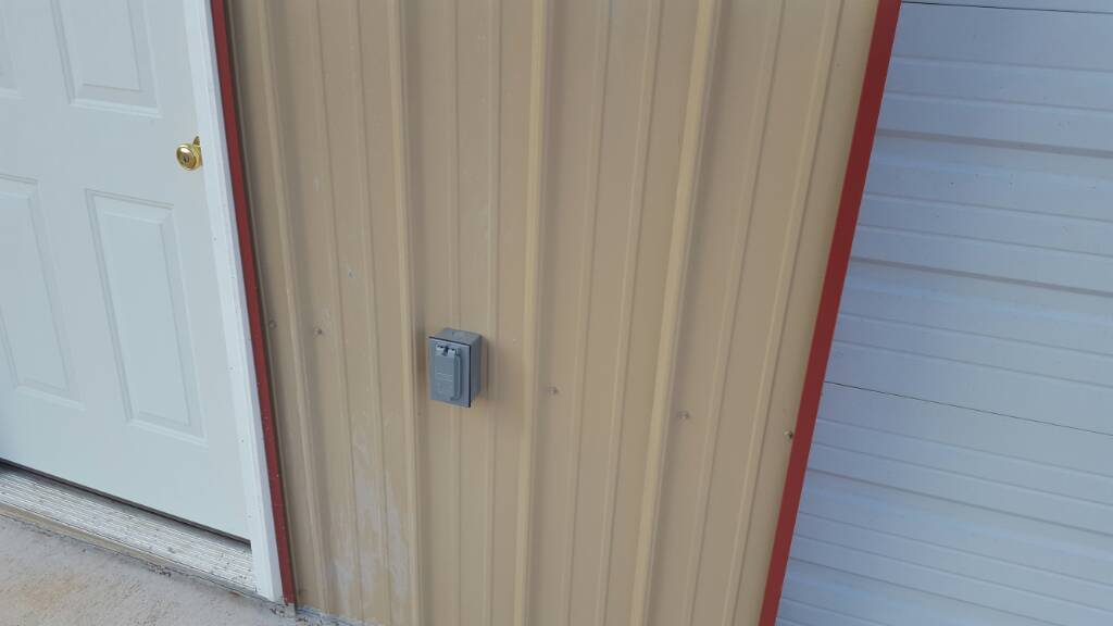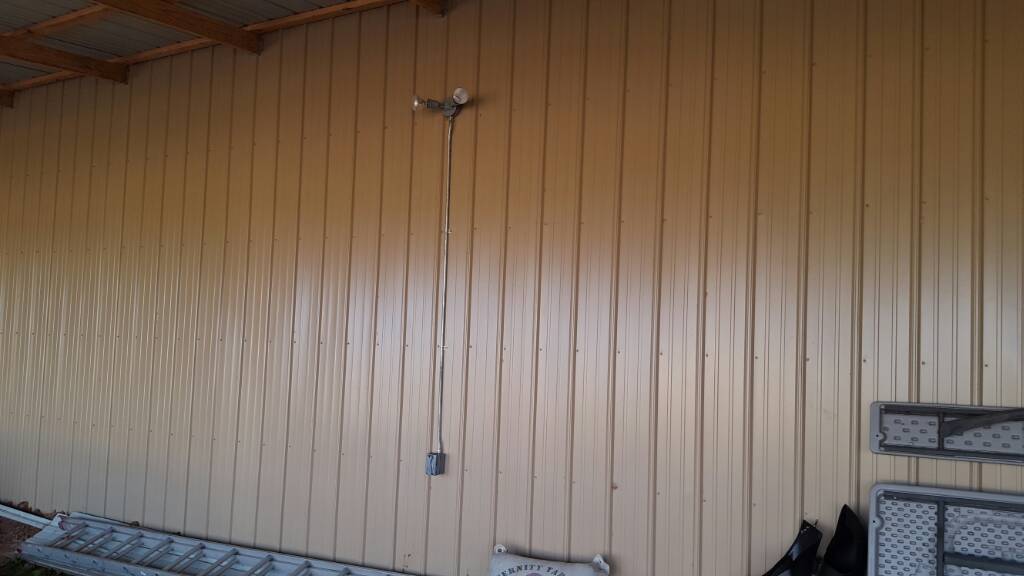 Electric is done and it came out great! I have not mounted garage-door-openers yet. Here are a couple of pics. Outside dusk to dawn LED, a 20/30/50 amp Rv plug, gfci outlets on all sides on the outside and a flood in the open Bay area. I will get more pics of the setup inside and post them up. Thank you all for the comments and suggestions....
