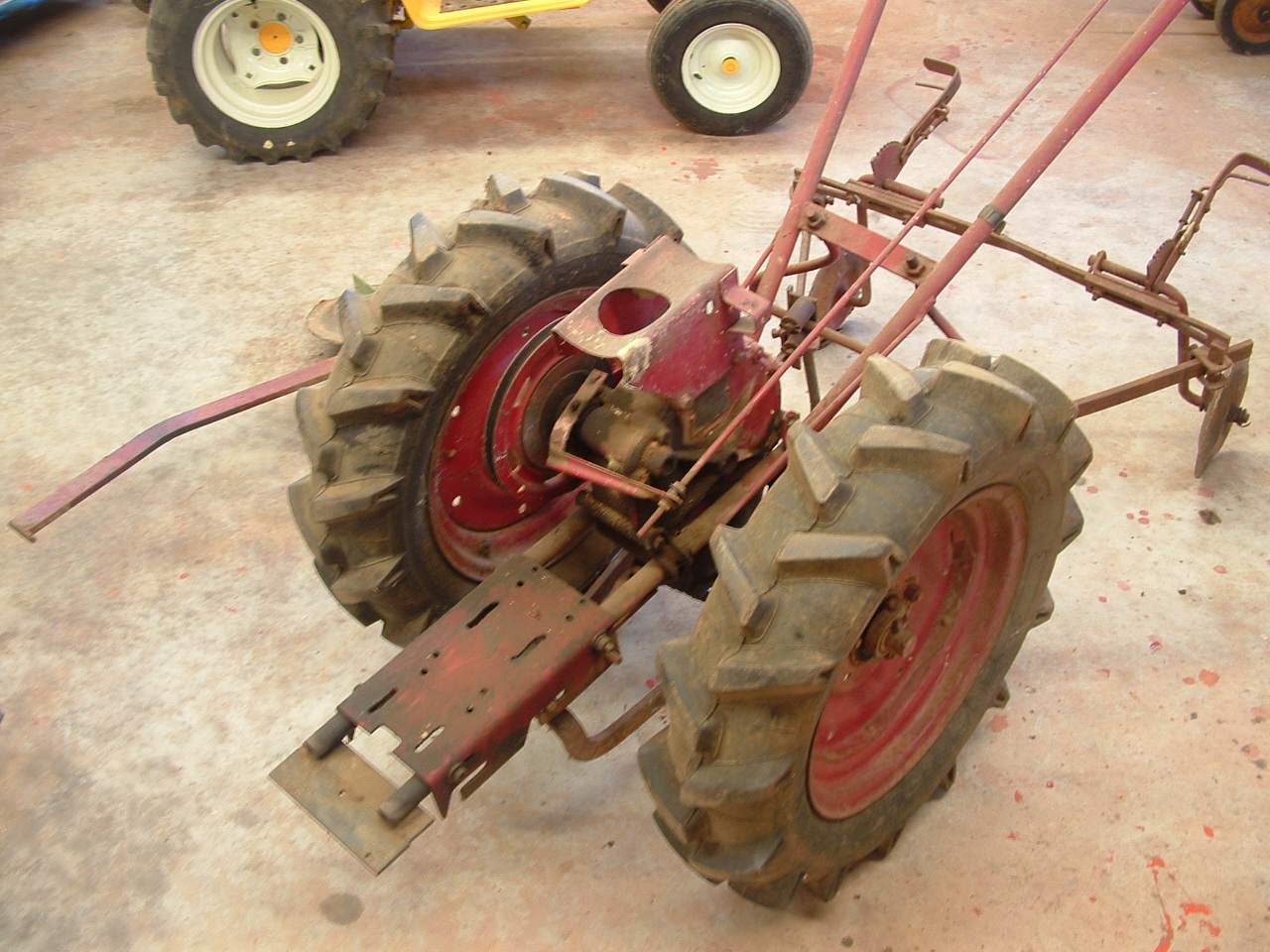 The vehicle in the photos/clips isn't a tractor (obviously) but a replica veteran car. It uses exactly the same drive motors and controller in the same dual drive setup as the tractor (although the reduction ratio of the transmission is different). I ended up reducing the power output for the final version because there was more power there in the 1300W drive than was probably good for it. Movie clips 1 through 4 are probably of most interest and show it just recently out the workshop and having its first test runs. (The clunking was my dodgy front suspension design which I subsequently changed.)