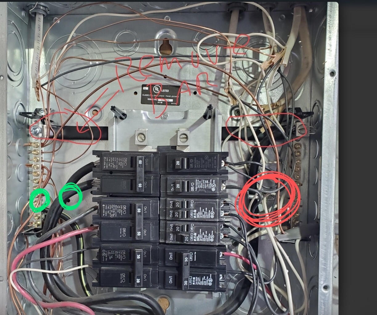 The large silver screw on the left held the jumper. It did not look like it would screw down enough to hold the 10 gauge wire I used, so I routed it farther down the bar. That is why.Similar to were you removed the jumper on the right (circled in previous post) there should be a screw hole next the left ground bar to use and the end can be inserted were you put the bare wire.