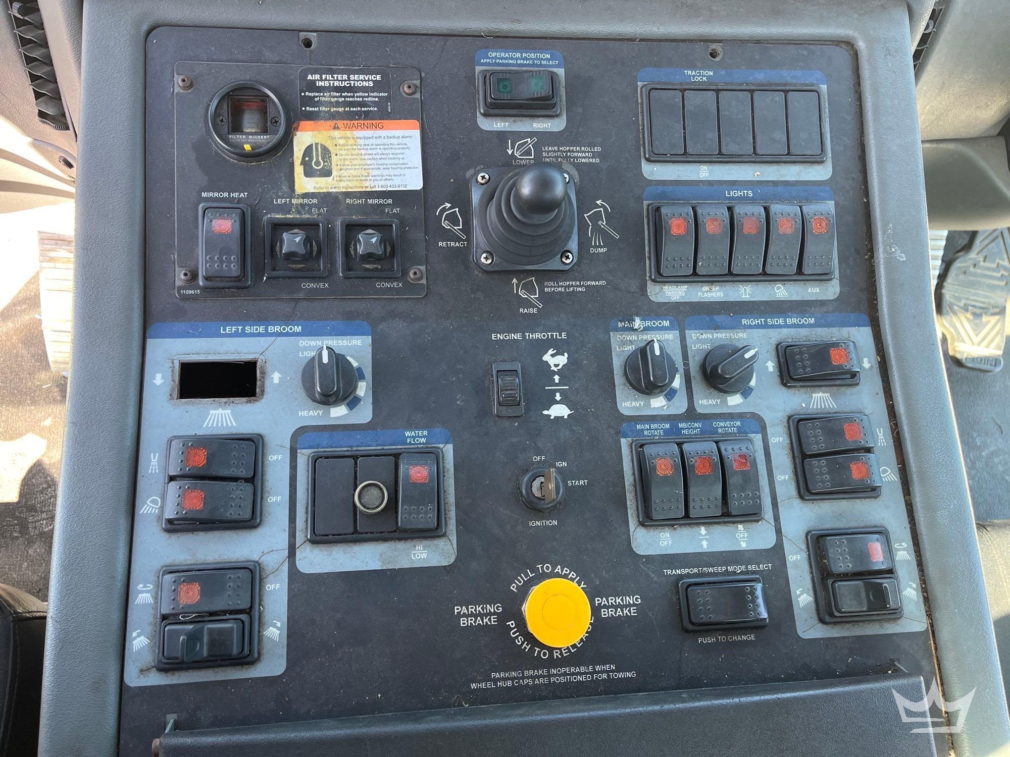 Location Tampa, FL; Hours read 5,714 hours. pwd by John Deere turbo diesel engine, hydrostatic drive. Equipped with: dual side gutter brooms, single mid-mounted main broom, 3.6 yard debris hopper, vacuum system, toggle switch broom controls, joystick hopper controls, adjustable broom down pressure, adjustable throttle, transport mode, AM/FM stereo with CD player, USB and AUX input, climate controls. Runs, does not drive. Limited function check completed at check in.