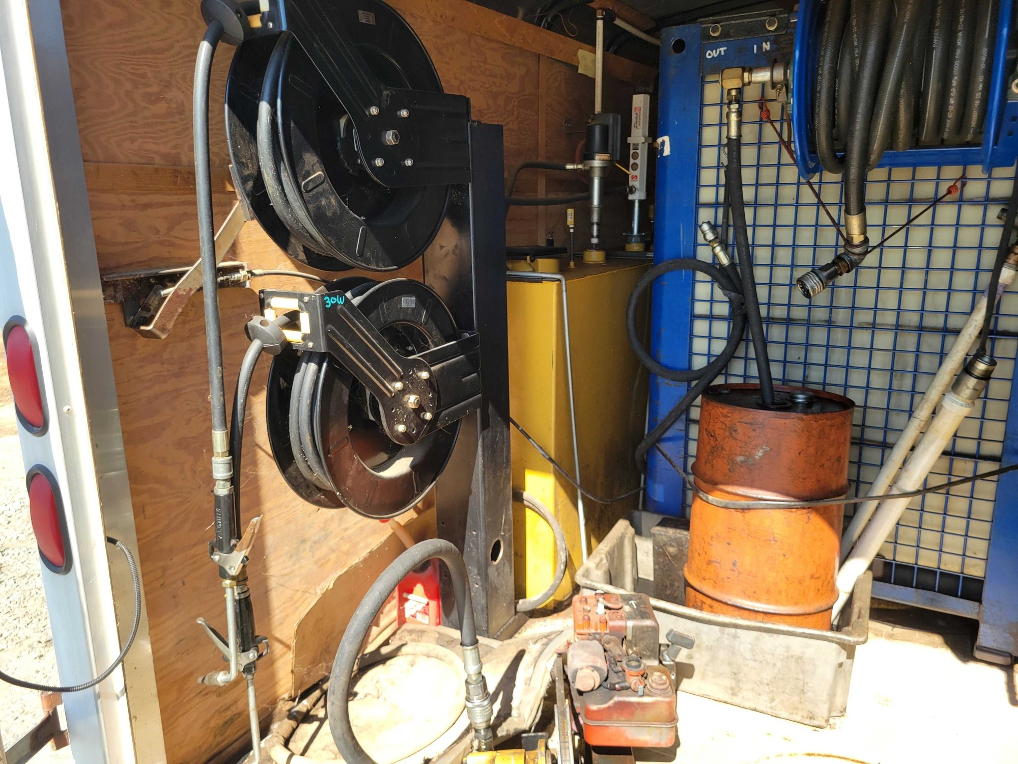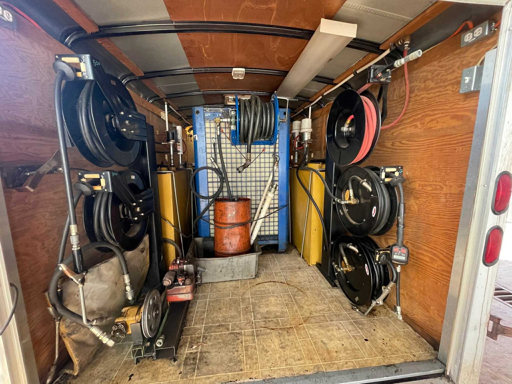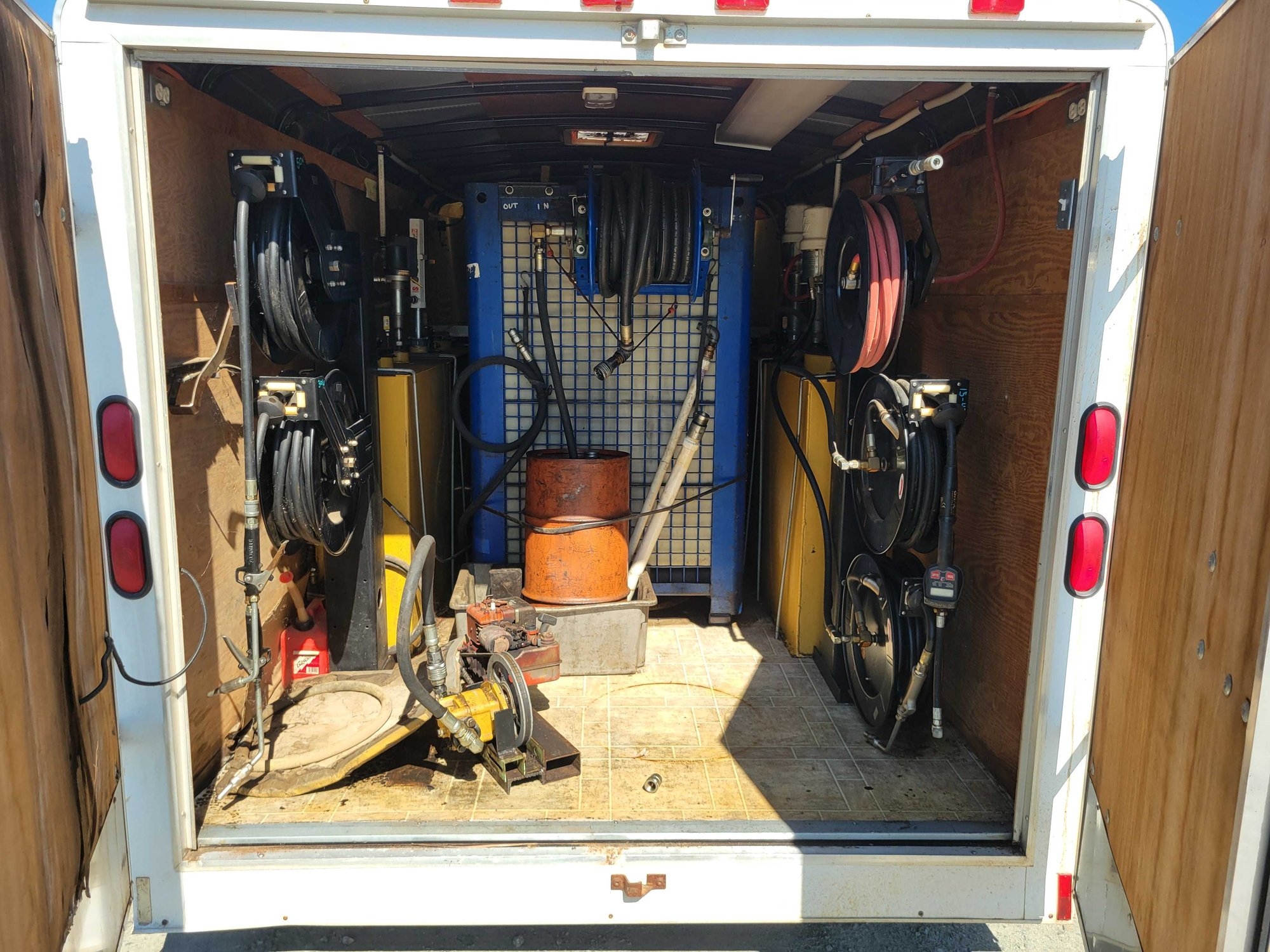 Enclosed Trailer with Lube System, 4 Product tanks, 1 Waste oil tank, 6 Hose reels, Sink, Work Table