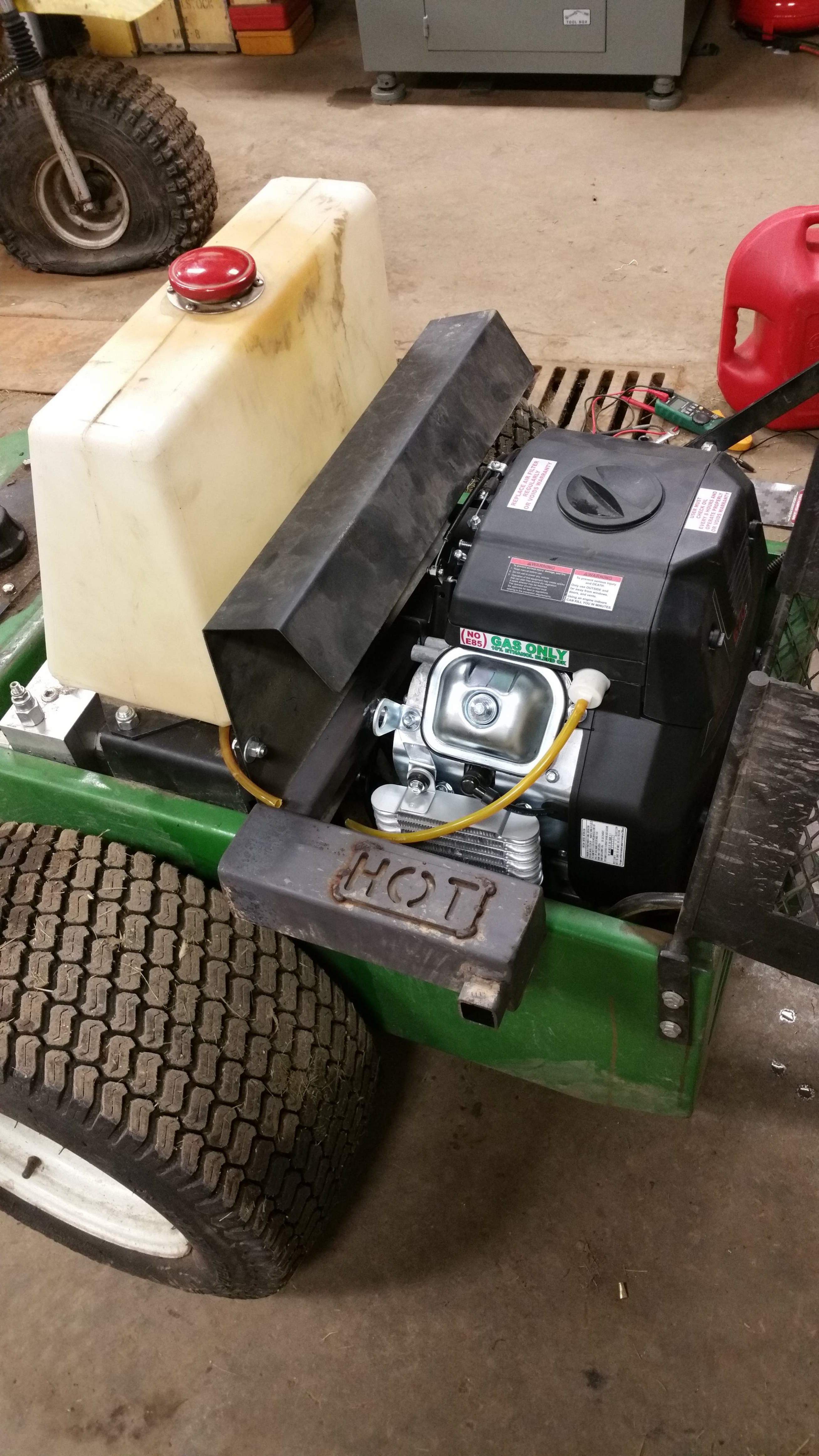 Being fully aware of potential quality concerns, I bought a 22HP Honda knock off from Harbor Freight for $600. The bottom mounting holes and pattern are identical to the Robin. The PTO side mounting holes were slightly different for the pump mount, so that had to be slightly modified. The Predator shaft is 1in opposed to the 1 1/8 on the Robin...a new lovejoy fixed that. I had to cut off a chunk of the driveshaft and space out the pump mount, but everything fits, however pretty tight. I did not have to modify the frame or cover to accommodate anything. I had to cut and weld the exhaust flanges at 90 degrees on the original muffler, but that fits nice now too. The existing controls for throttle, choke, and start all work as they used to and the wiring was simple to deal with.