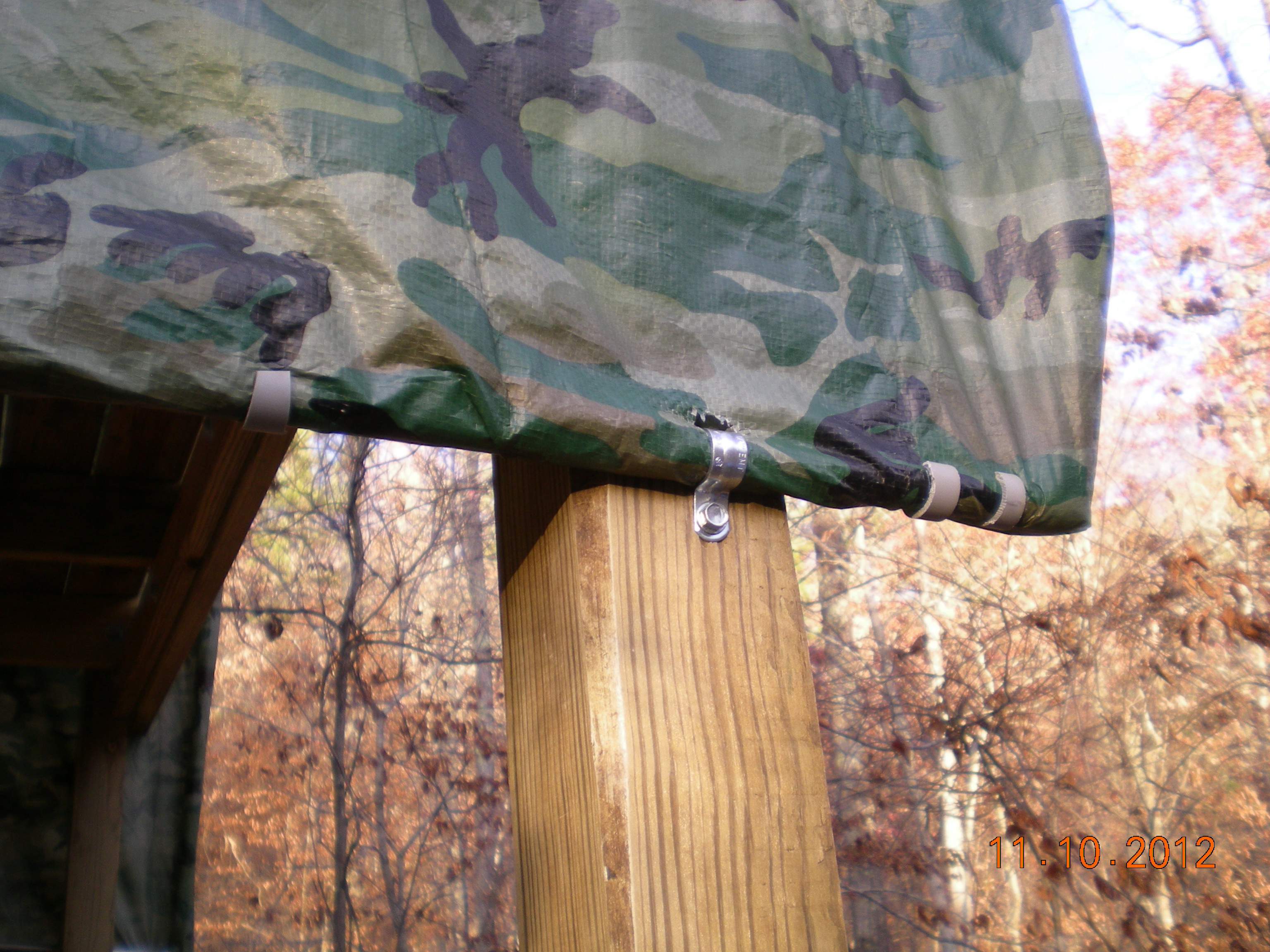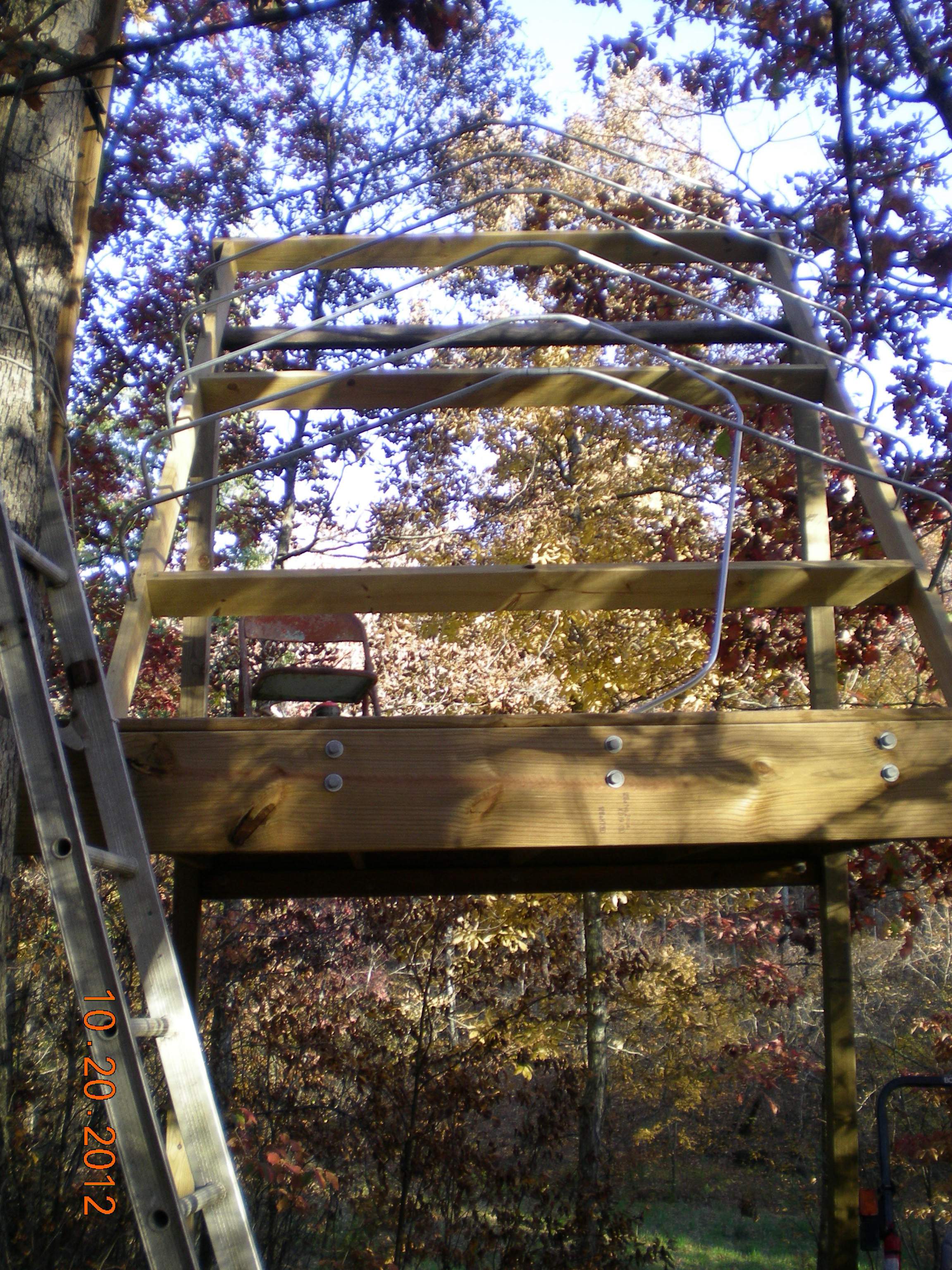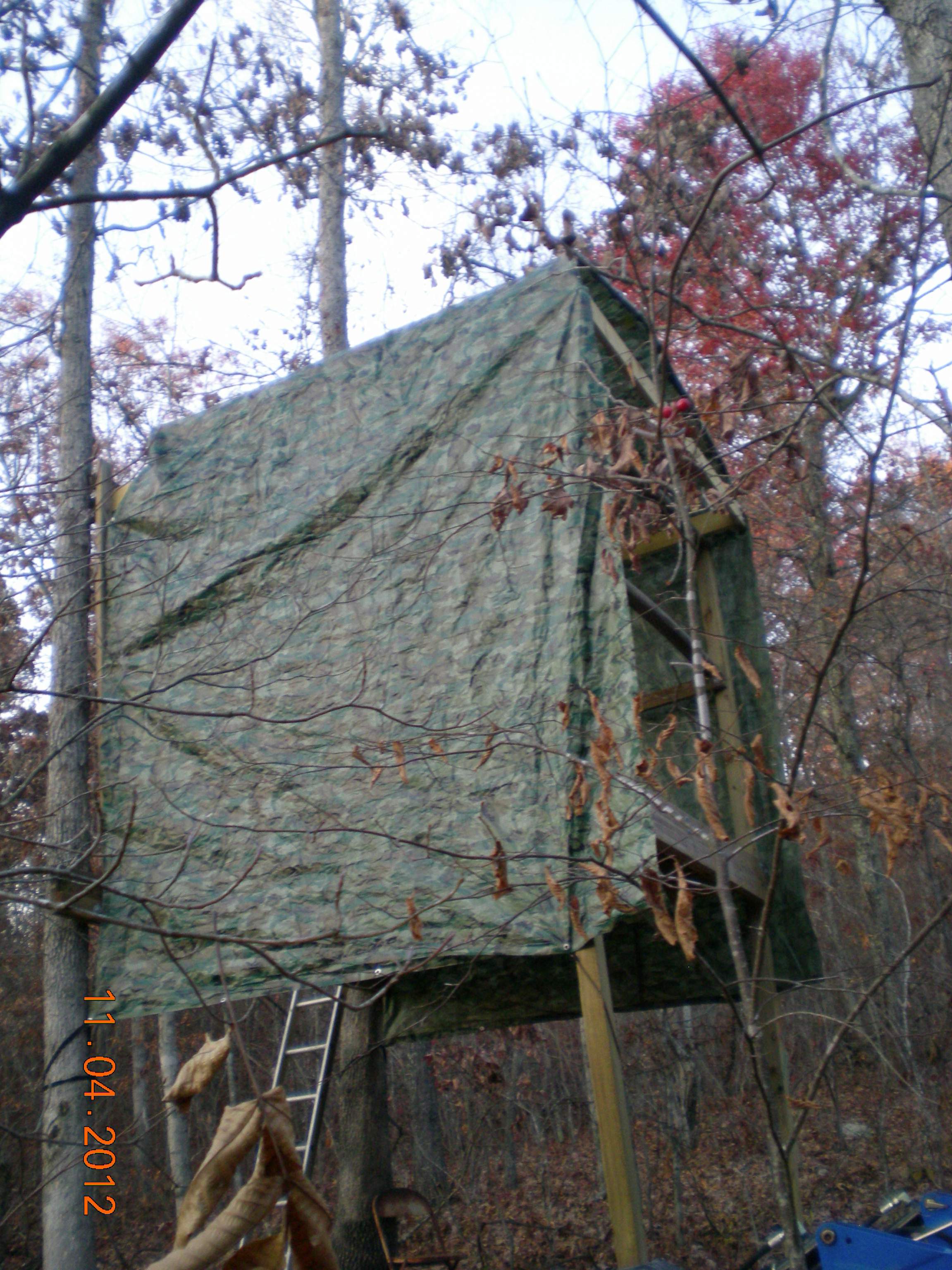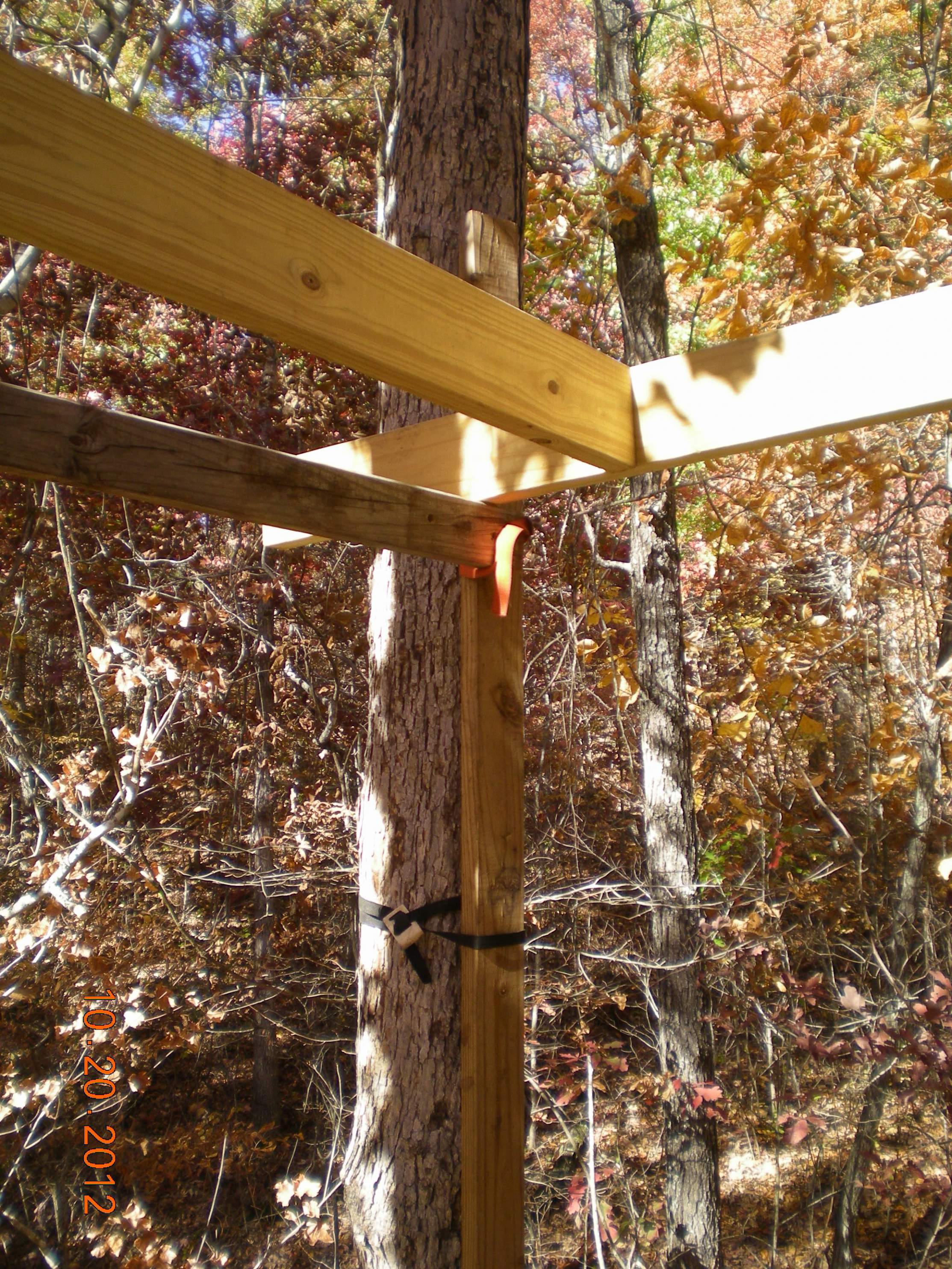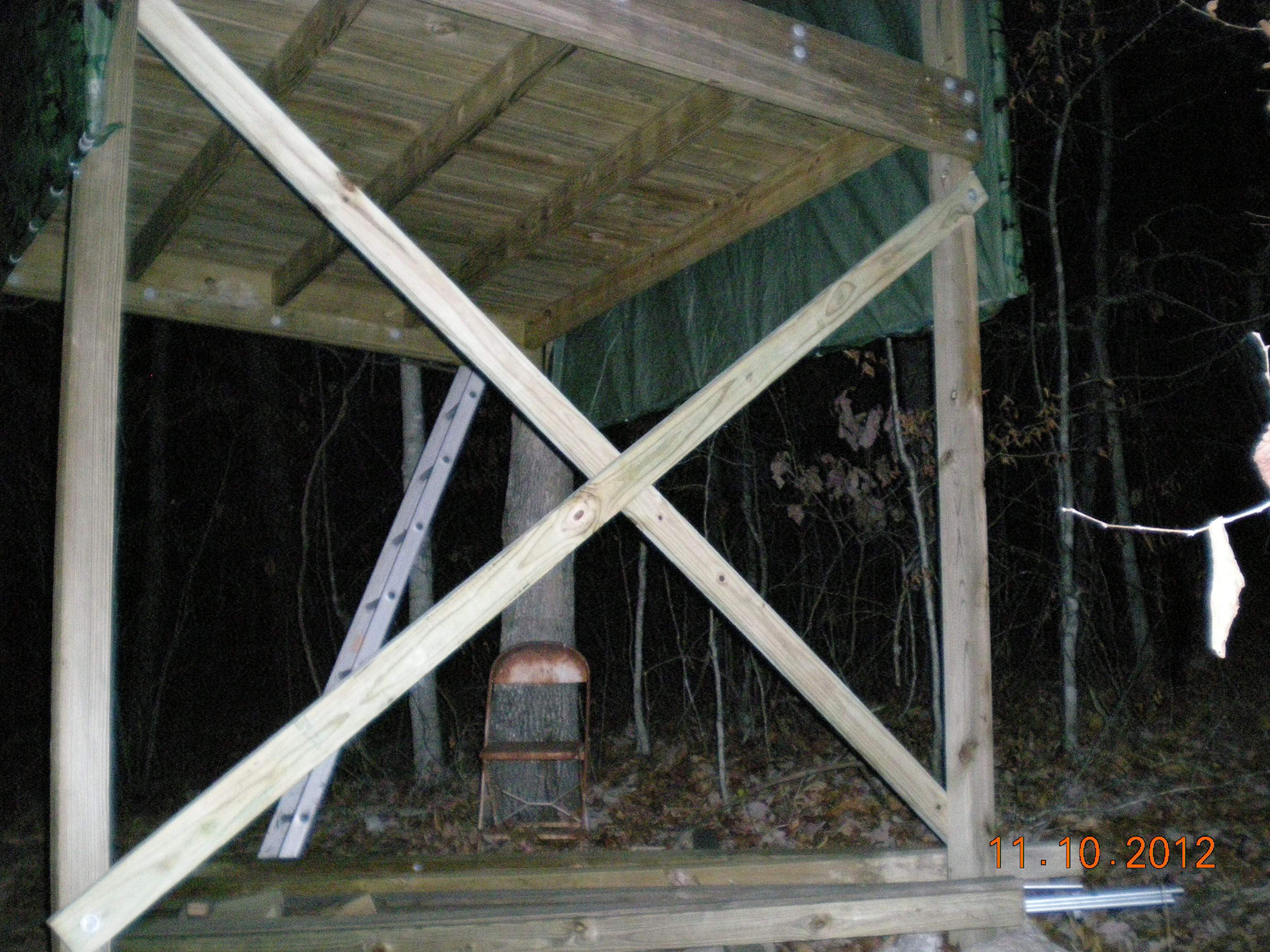 There is an 8x8 ft deck about 10 feet above ground, supported by two trees and two 4x4 in legs, on a hillside above a meadow in the middle of my property. In the past I cobbled a hunting blind atop it out of ropes and a tarp, but it really needs a roof and sides and a gunrest and a shooting window (and a carpet and some comfy chairs and a coffee maker and a flatscreen TV and ...