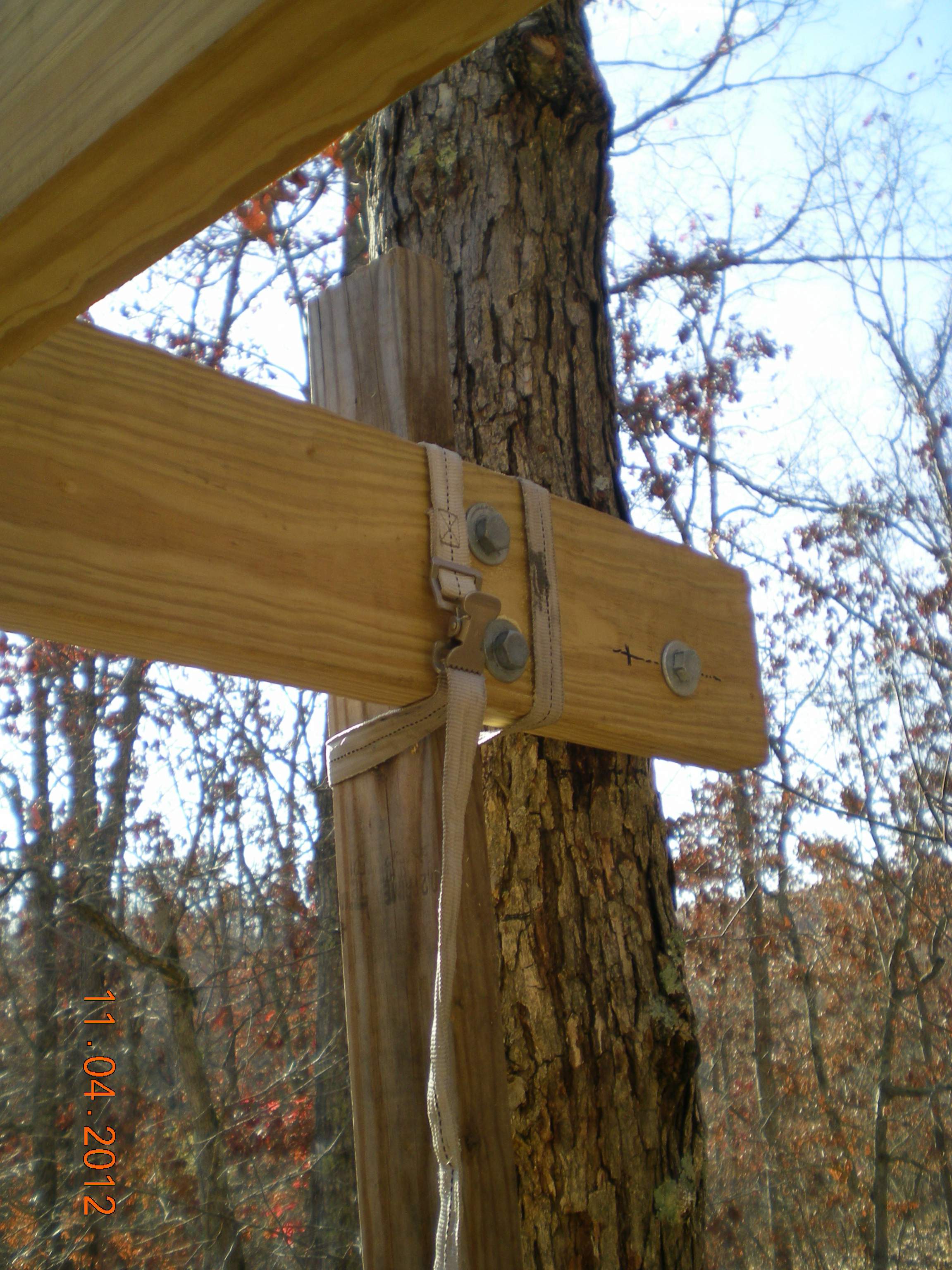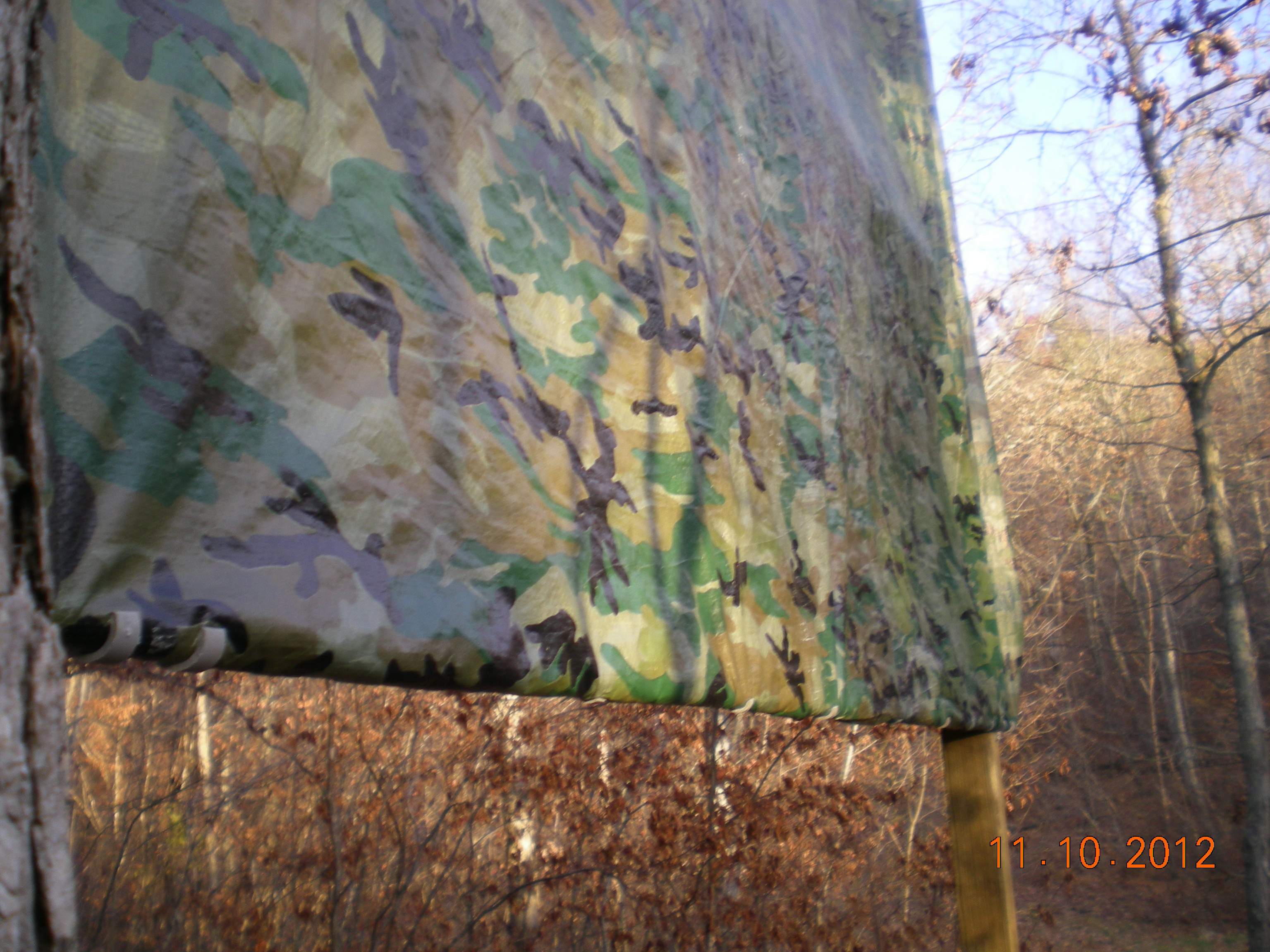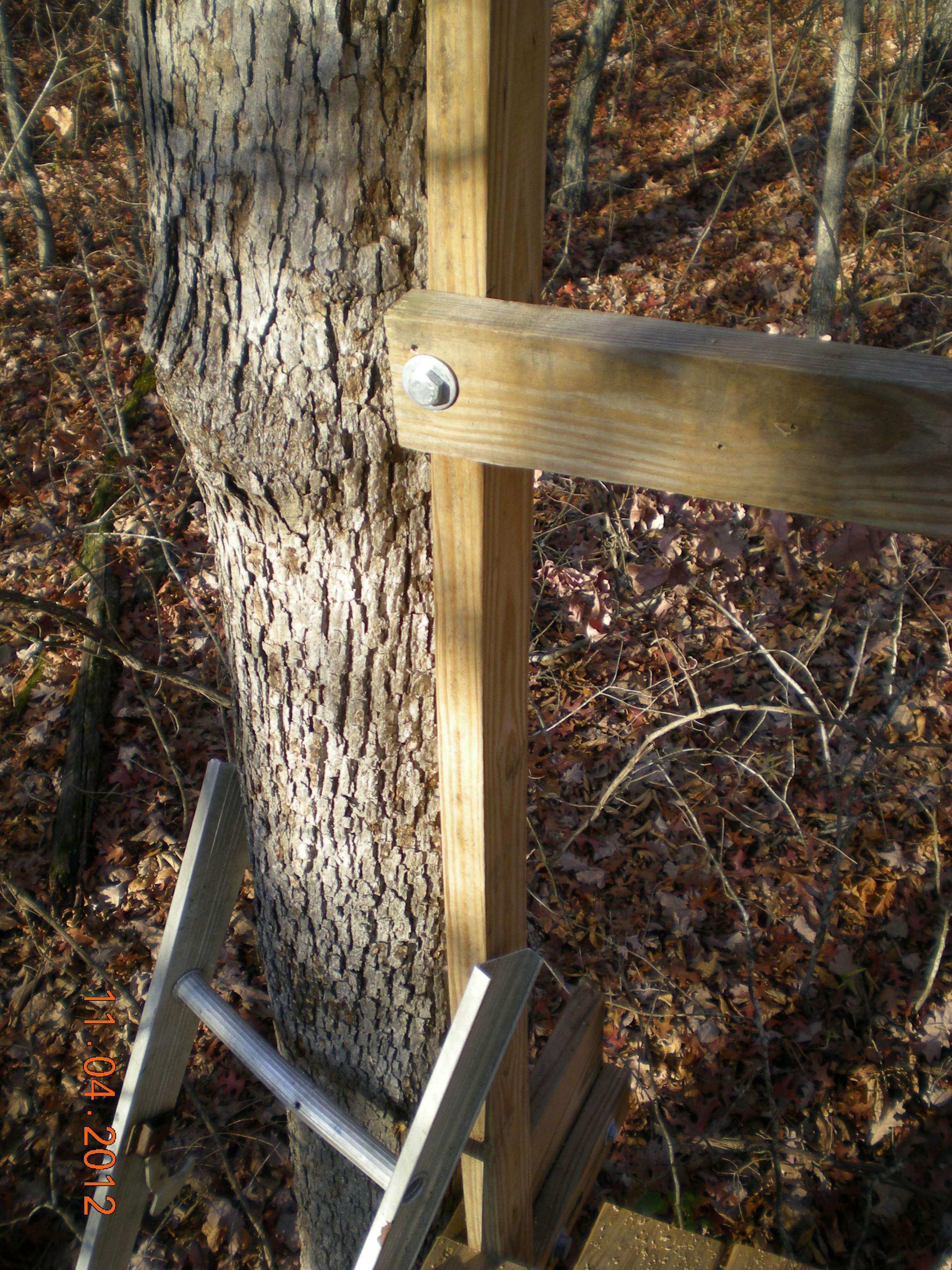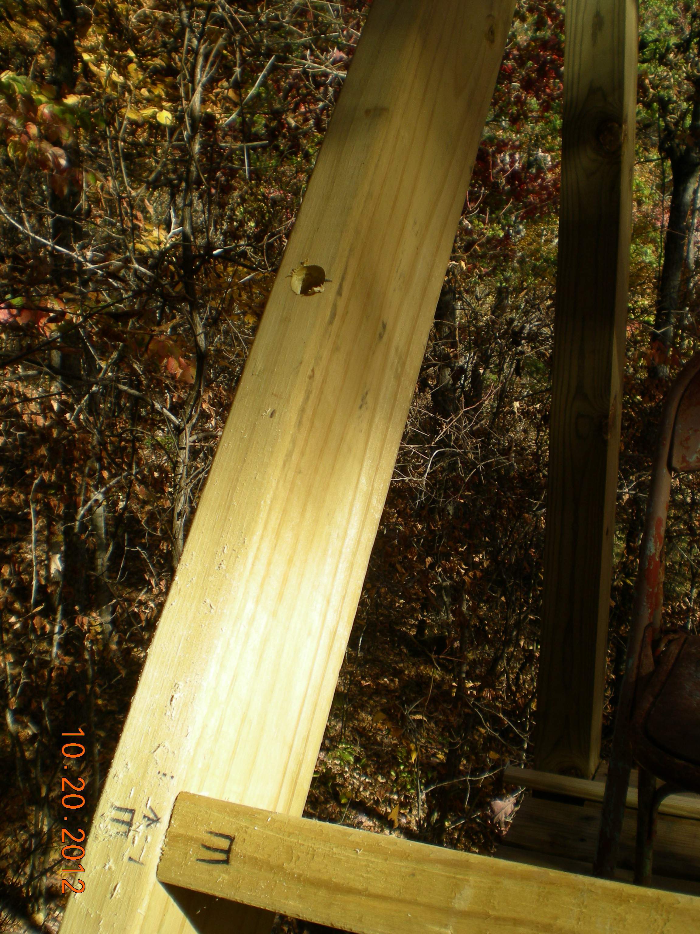 There is an 8x8 ft deck about 10 feet above ground, supported by two trees and two 4x4 in legs, on a hillside above a meadow in the middle of my property. In the past I cobbled a hunting blind atop it out of ropes and a tarp, but it really needs a roof and sides and a gunrest and a shooting window (and a carpet and some comfy chairs and a coffee maker and a flatscreen TV and ...