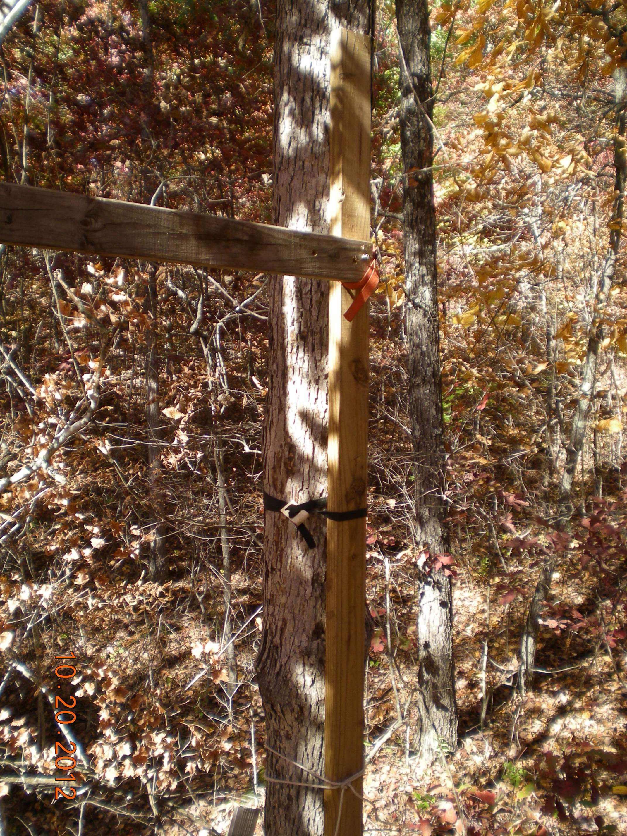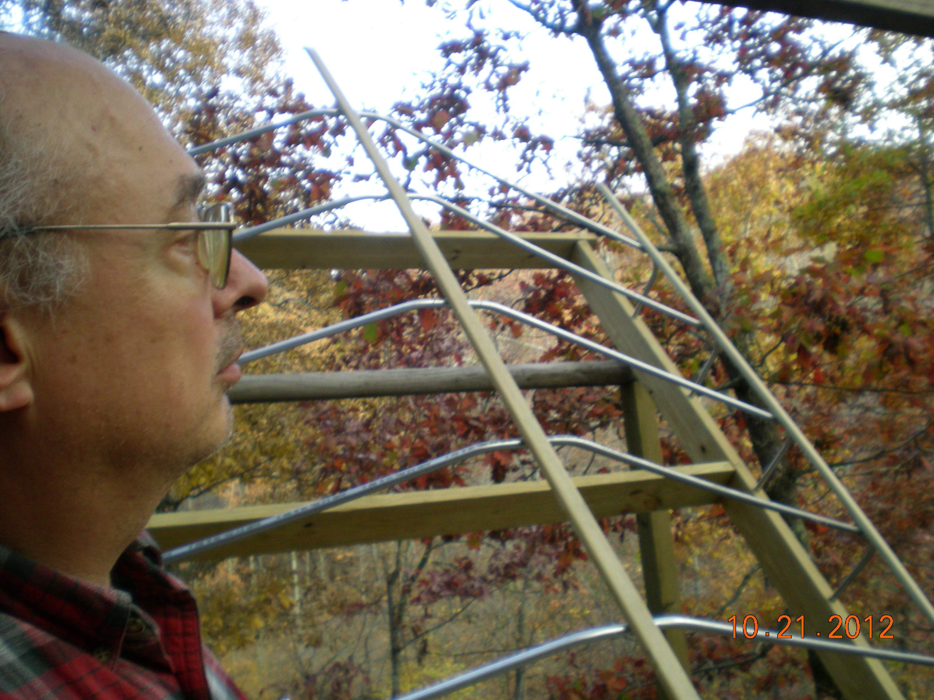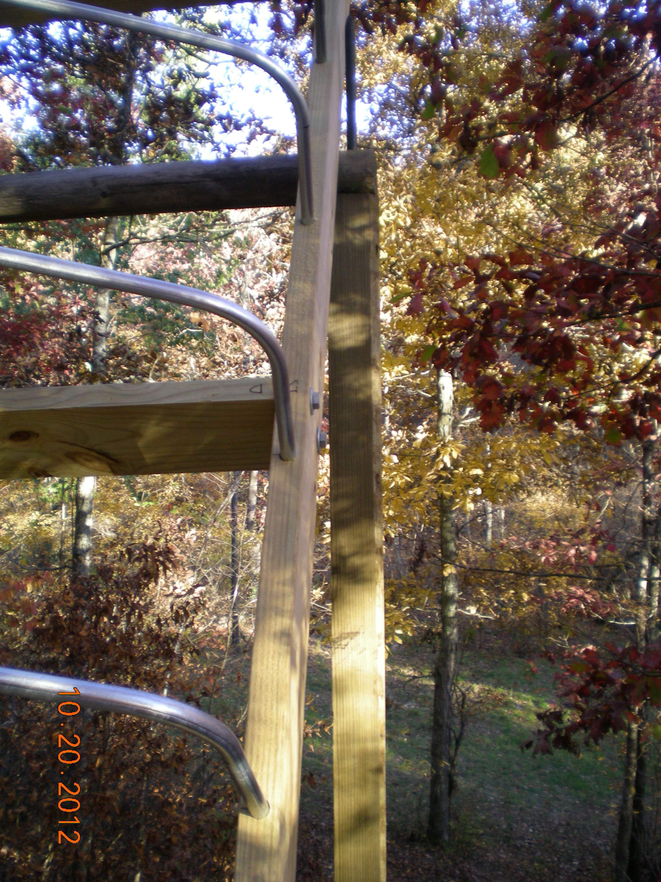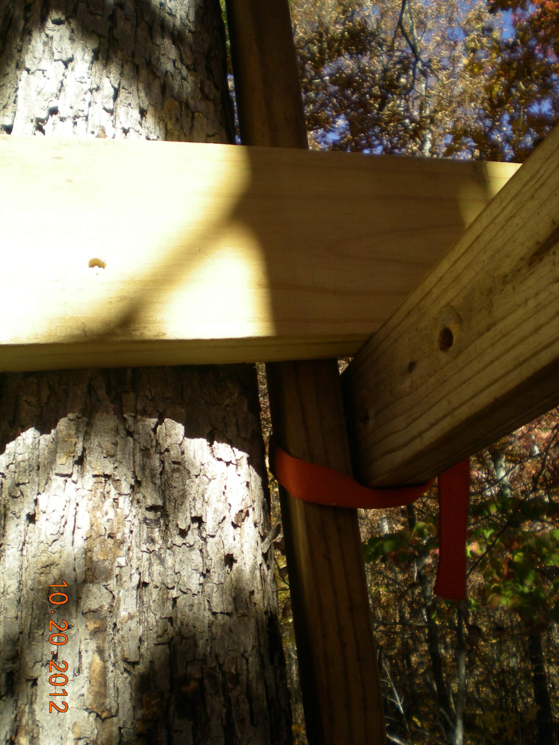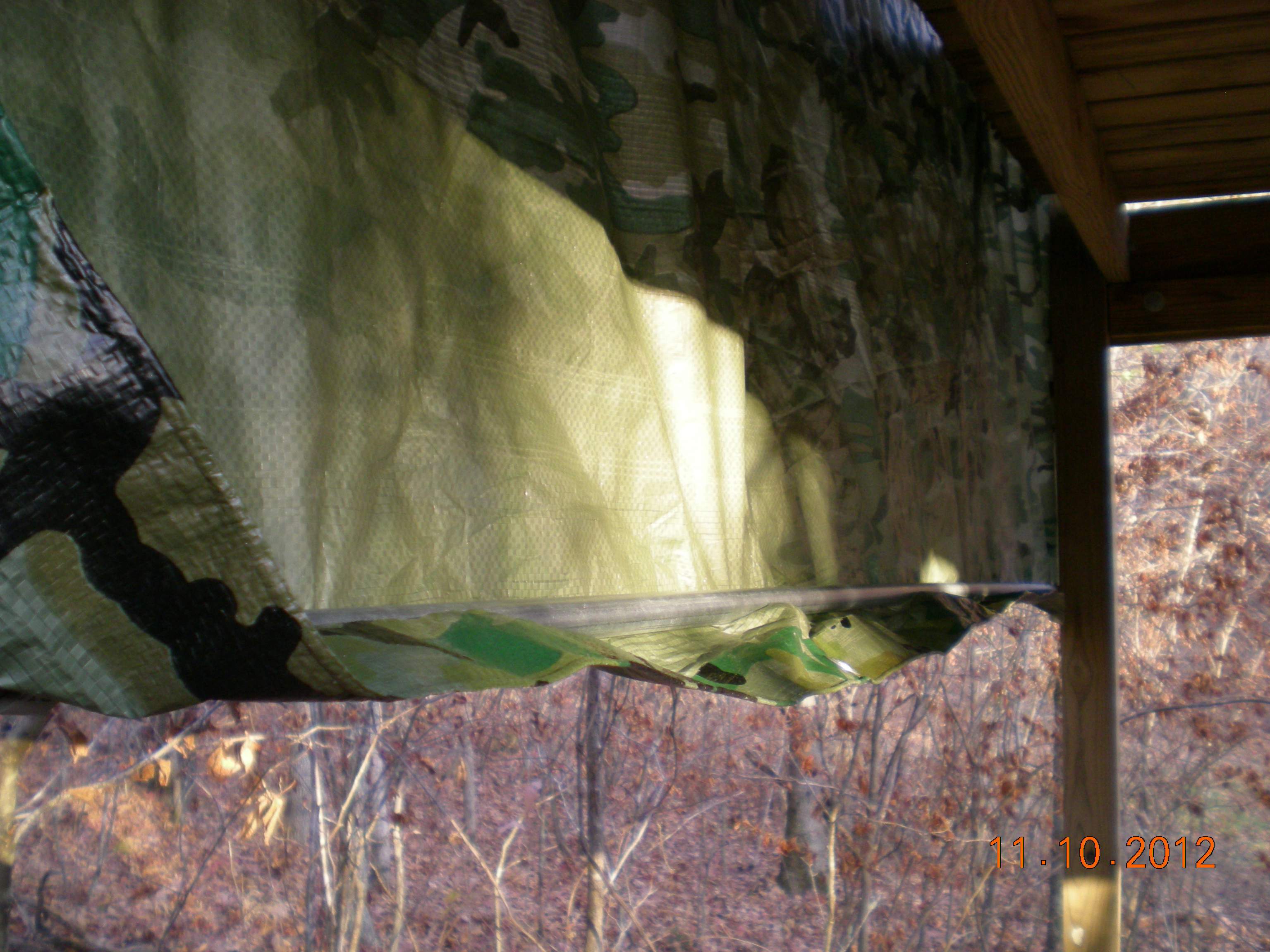 There is an 8x8 ft deck about 10 feet above ground, supported by two trees and two 4x4 in legs, on a hillside above a meadow in the middle of my property. In the past I cobbled a hunting blind atop it out of ropes and a tarp, but it really needs a roof and sides and a gunrest and a shooting window (and a carpet and some comfy chairs and a coffee maker and a flatscreen TV and ...