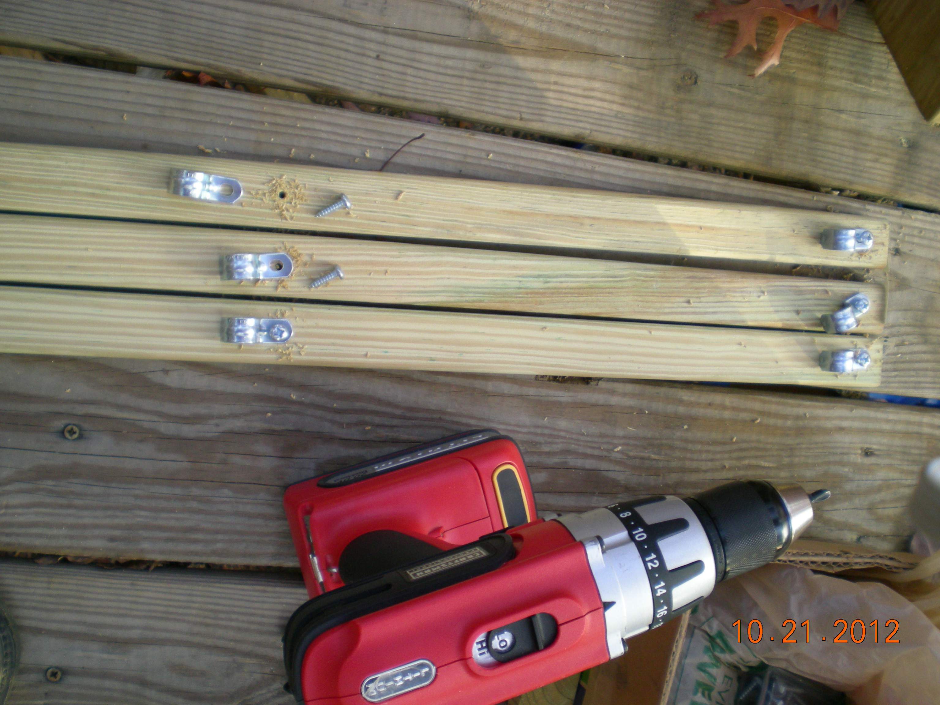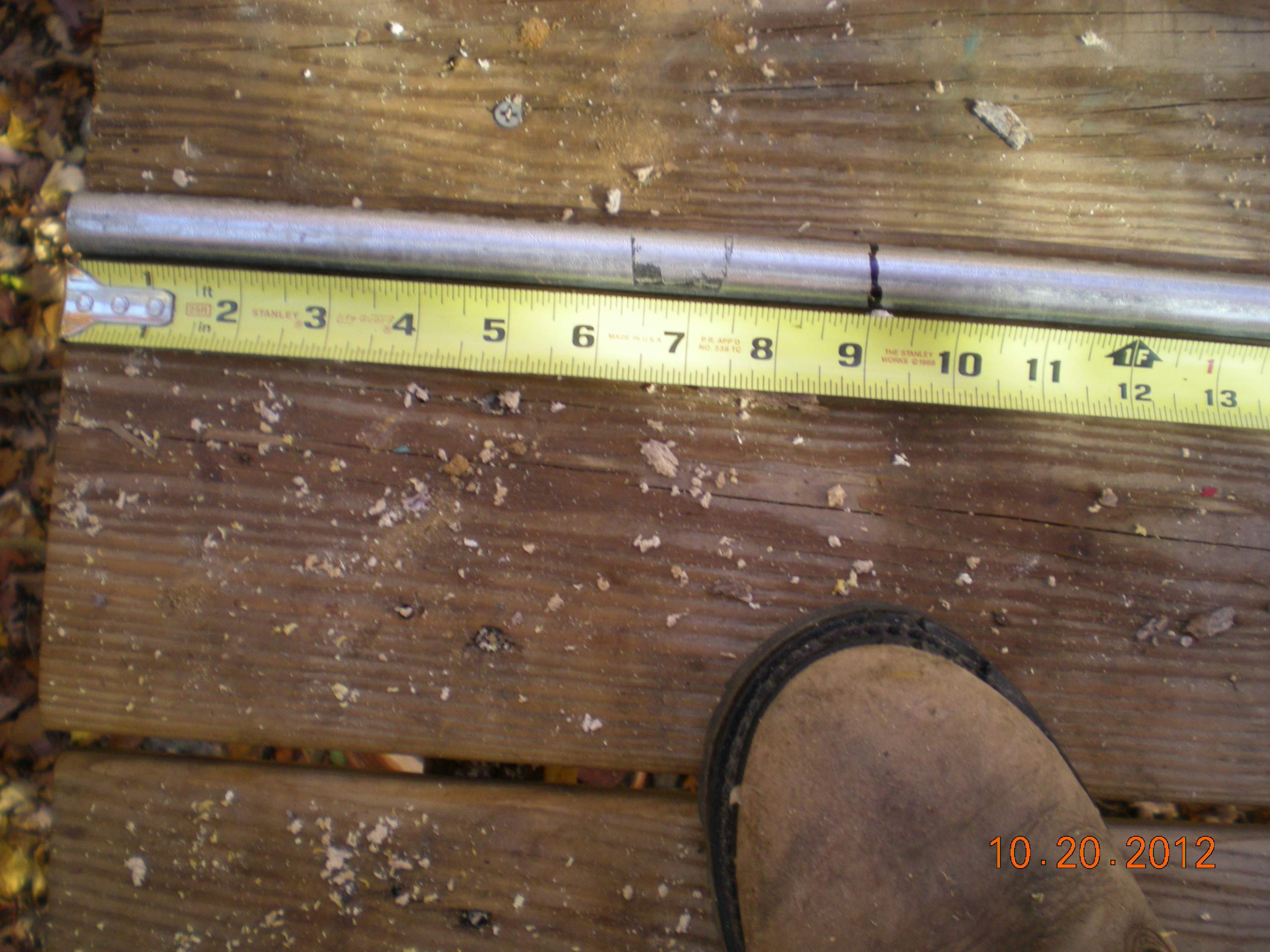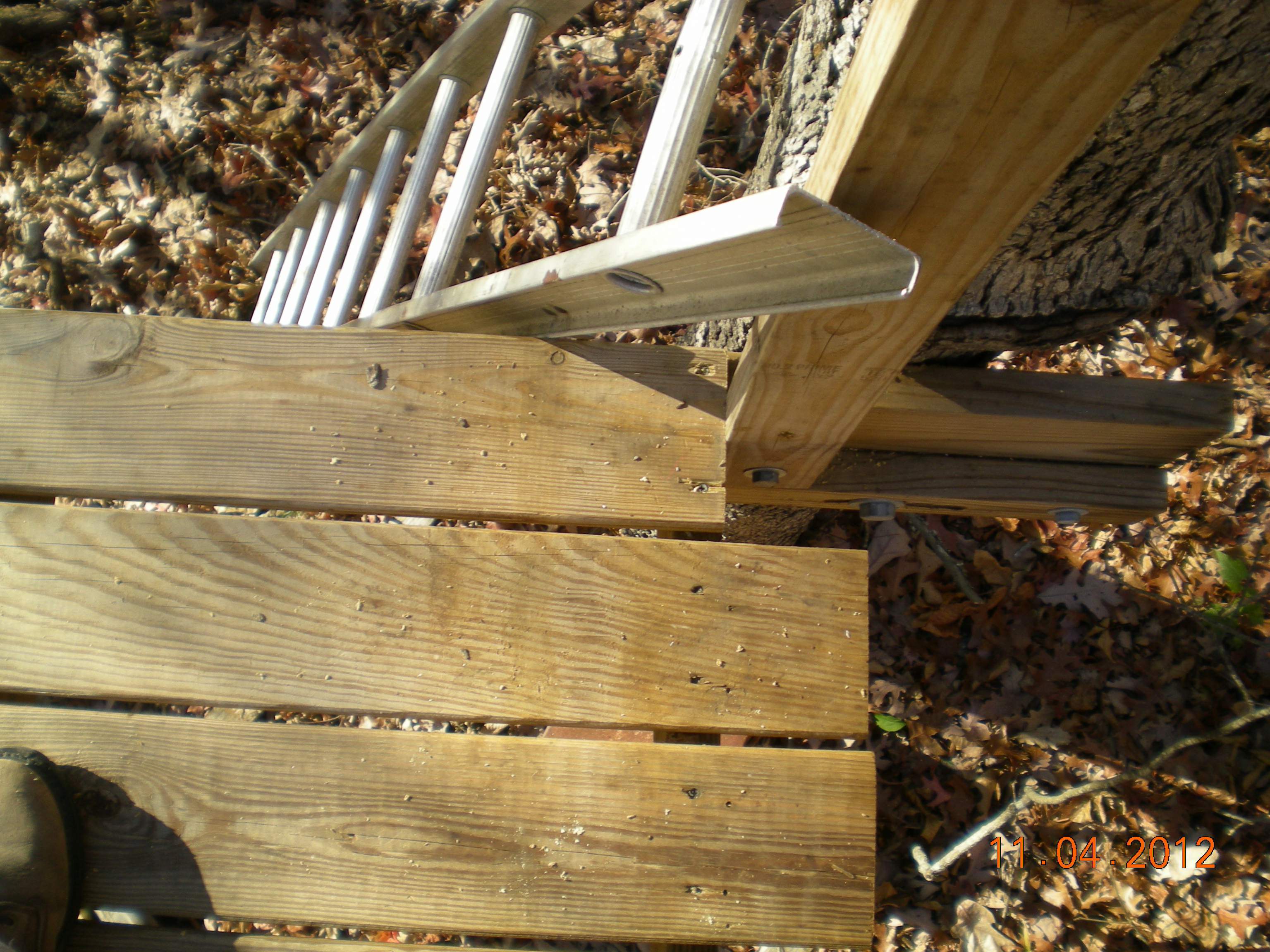 With the FEL holding up the platform, I removed one leg, replaced it with the longer post, drilled pilot holes and lag-screwed the new leg in place: