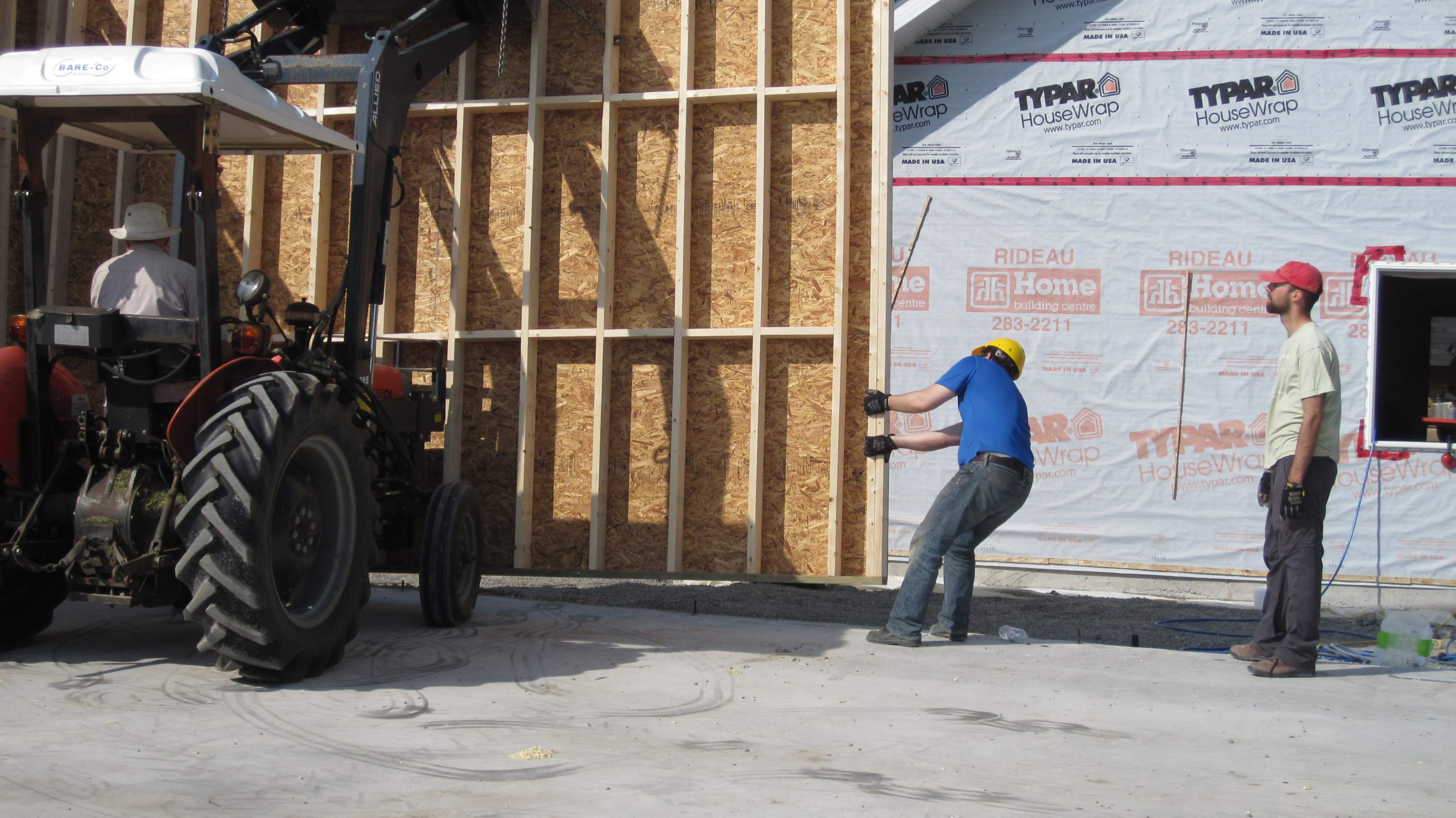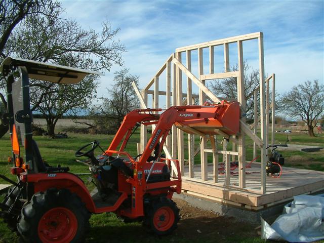 The other garage last summer had a 9' ceiling, so I left off the top foot of sheeting and lifted the panels into place with the loader on my Massey 35. The 35 will be outgunned with 12' panels, though, as it won't reach very high.