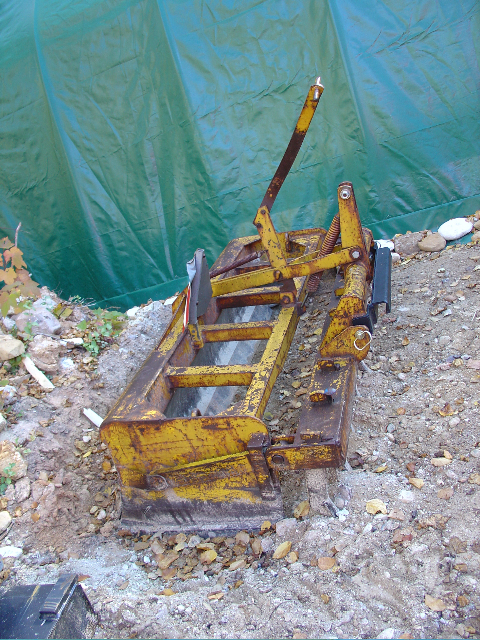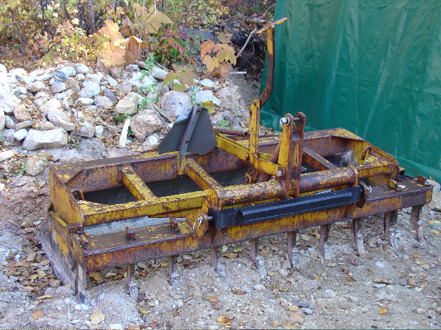 This is a backblade I bought from a friend for use on my 3130. It weighs about 1,500# and really transforms my bota into a weapon - I've ripped through a good deal of quartz/shale in the mountains. The plates on it are very old and so I'm not able to read the manufacturer etc. The black piece on the front is one I had welded up, to allow me to use the ballast box spreader bar to pick it up without messing with the three point pins etc.