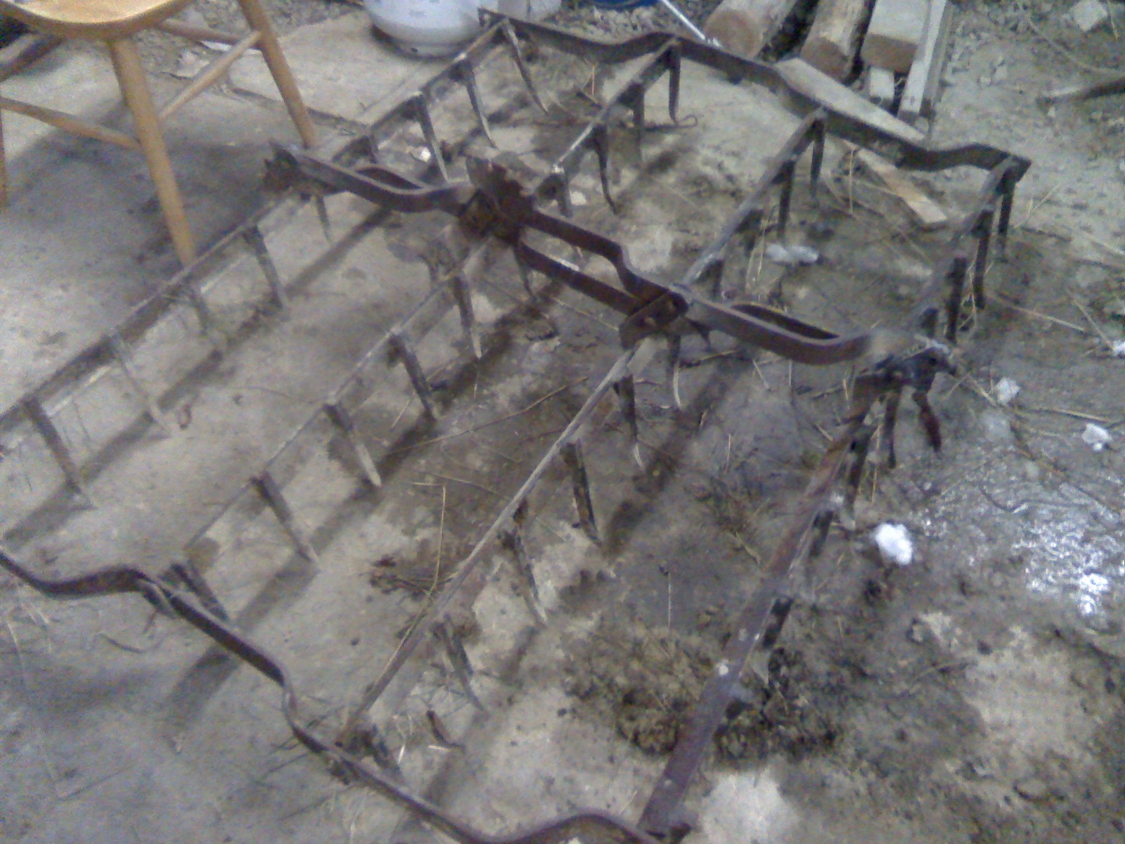 The spike tooth harrow shown was headed to the scrap yard resembling a pile of bent-up T-posts, with spikes. I rescued it, re-assembled it and welded it up solid.