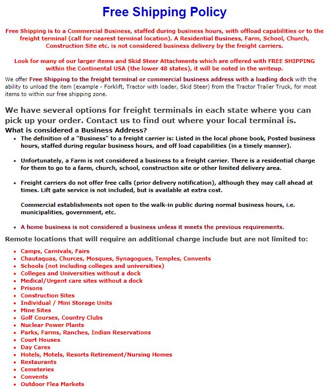 Perhaps it should say something like "some items can ship to any freight terminal anywhere within the contiguous United State for free, and others can ship for free to anywhere within our coverage map - SEE THE MAP AND CALL US FOR DETAILS.