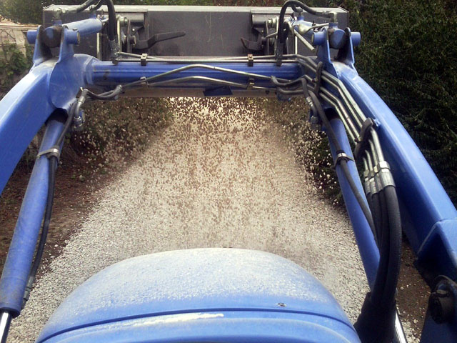 I have spread salt and sand with a FEL. It requires skill and lots of practice. It also depends on how "flowable" the material is.