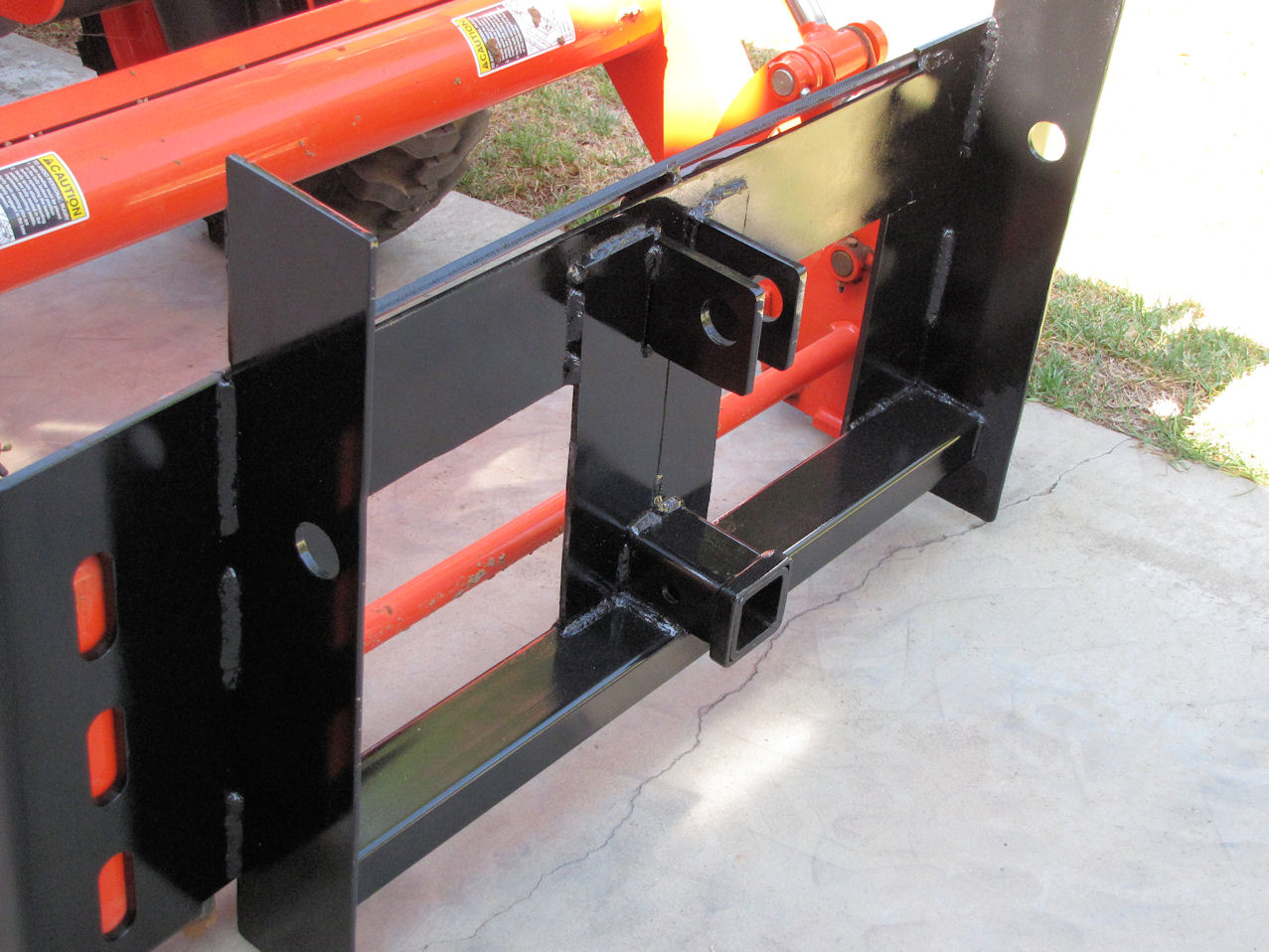 Some time ago I fabricated a QA forklift for my B26. I've used it a LOT. To help me move around about 12K lbs in boat/trailer I added a hitch receiver to the QA forklift rig (shown w/o the forks/bar). I opted for a front mounted rather than a 3pt hitch receiver as this gives me a much more comfortable driving position-direct view of the rig, plus the backhoe provides a good counterweight.