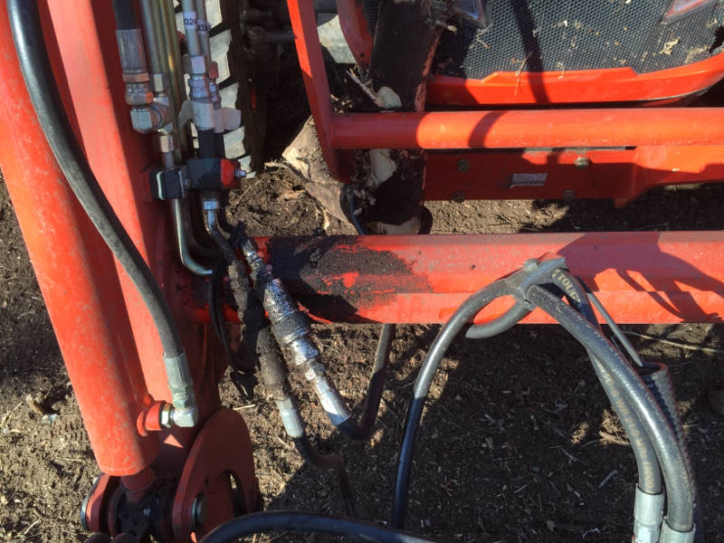 I run with my loader low. Today I popped a bunch of stumps out of the ground and one stump went missing. I didn't think much of the missing stump until I jumped out of the cab to grab something. Walking around the front of my tractor I found my missing stump had leashed itself to a third function hose.