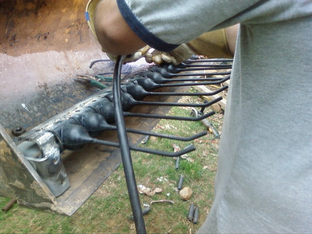 Ok, here's our new adventure. Since I generally have my backhoe loaded. I needed a way to rake up limbs, leaves etc. Unfortunatly, my first idea ran into an unexpected problem. I was using springs from an old trampoline with rebar on the end. After welding on 30 springs, we find out that welding on them makes them very brittle. :( Brought me to an abrupt end.