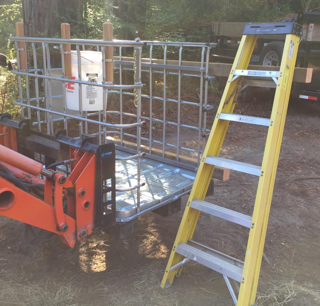 I am replacing all the windows and siding on the Mendocino place. Three buildings and a lot of work. Rather than ladders or scaffold I decided to make a work platform for the tractor. I have seen two or three TBN folk use IBC Totes, which looked like a good idea. So I did the same.