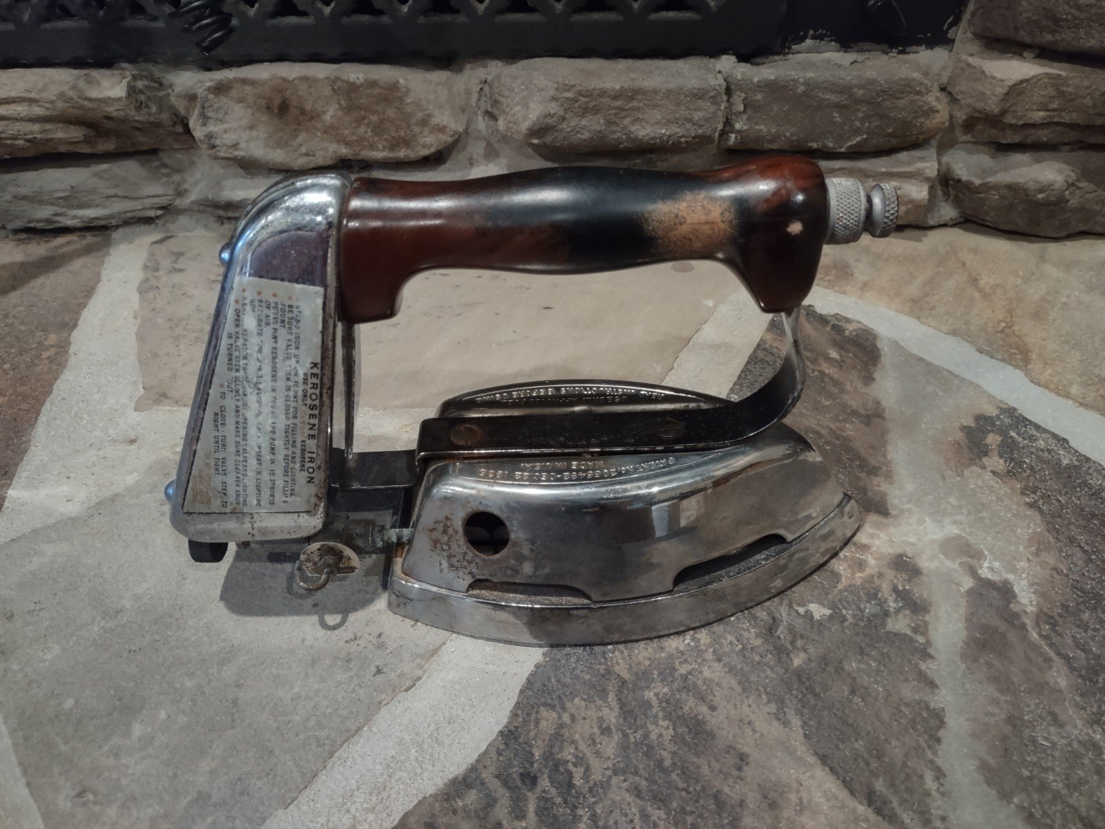 An iron iron (which was kept on the wood cook stove and used until I was in my teens) and a kerosene iron.
