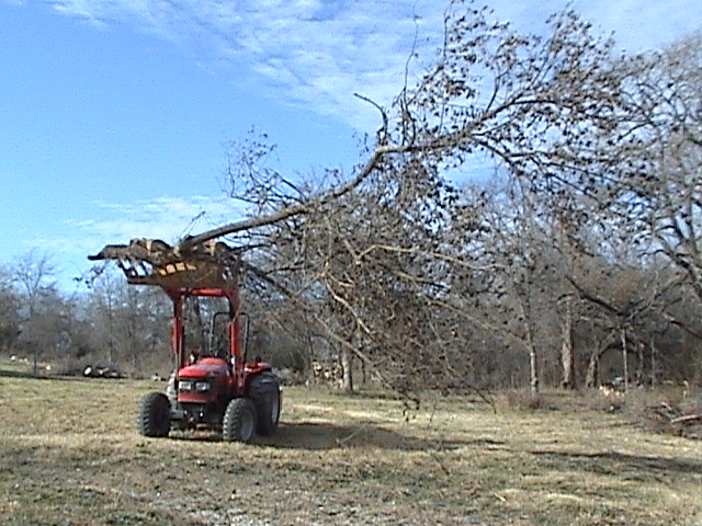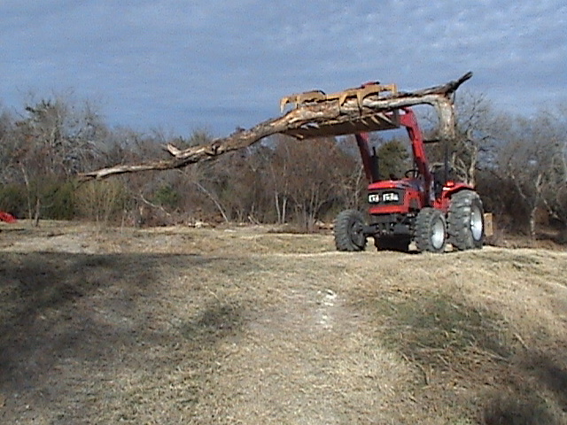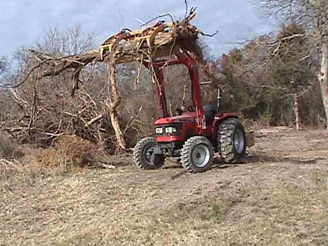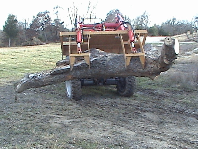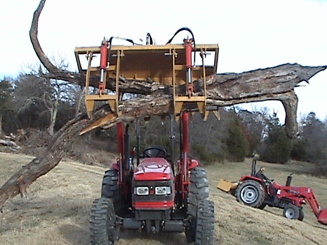 I will have to post back when I get a chance to start using the forks. I don't think I will have a problem with the grapple flexing from uneven loads, but time will tell. My main use at first is moving about 250 red pines. They are about 32 ft long and 12 in across at the base. They were already cut down when we bought the land. I need to go through the piles and see if any of them are still any good. If some are decent I will cut them into 10 ft lengths and take them to a saw mill. If not they will all end up in a burn pile. I figured the forks will also work good for moving the stumps from these red pines when I start pushing or digging them out. I think the forks should work decent for brush, but not as good as a root rake style grapple. I don't have much brush right now to move, but I may make the root rake part to add to this grapple anyway. I like your idea of pivoting the grapple on your top rod. As far as view out the front you mentioned, I would think if you made the grapple with a fairly open design you could have a good view through it. That is until you grab a load of brush or something. Keep us posted.