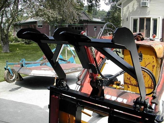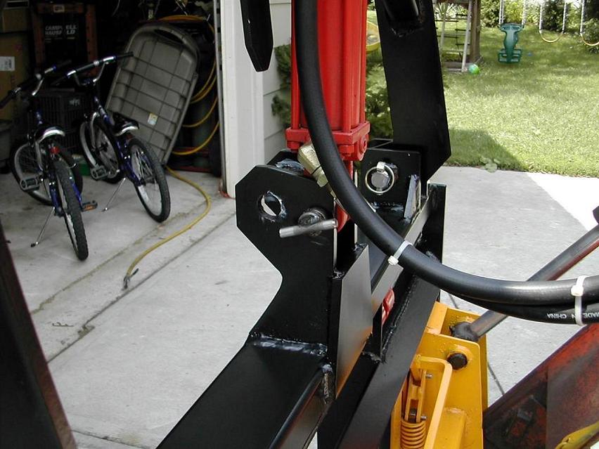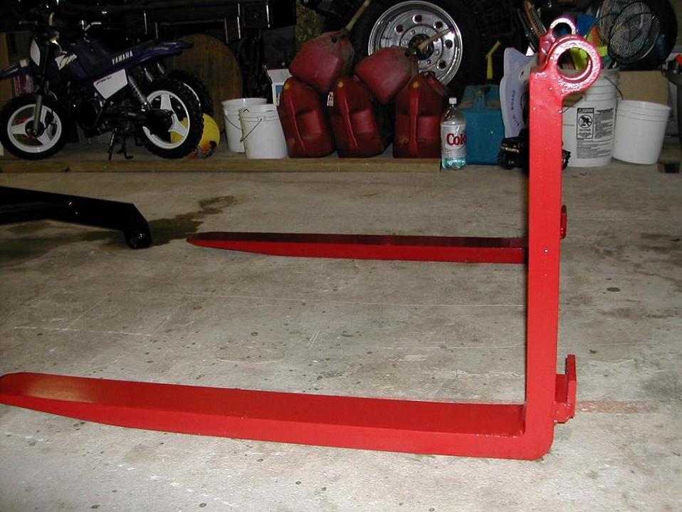 Your grapple looks great. You asked for some pictures of forks. Here are some pictures of the forks I built last spring and painted this summer. I picked up the forks locally that someone had on ebay. The design centered around using up some steel left over from some other projects. I really wanted a grapple and decided to add it to the forks. The forks slide on the rod and I welded the "L's" to the forks to keep them from swinging out. The forks can go completely together by pulling the rod and putting the forks in the center section. I added a second hole in the grapple cylinder top mount, so when the grapple is open I can pull the top pin and put it in the back hole. This allows the grapple to stand up staight and I figured it would not get in the way when moving larger items on pallets. I figured I would make a completely different root rake grapple later, but have since thought I could build a rake section that can go on this setup in place of the forks. Should be easy enough, I hope. I have not had the chance to really use the forks and grapple yet, other than to pick up a couple things to test them out. This next summer they should get a work out.