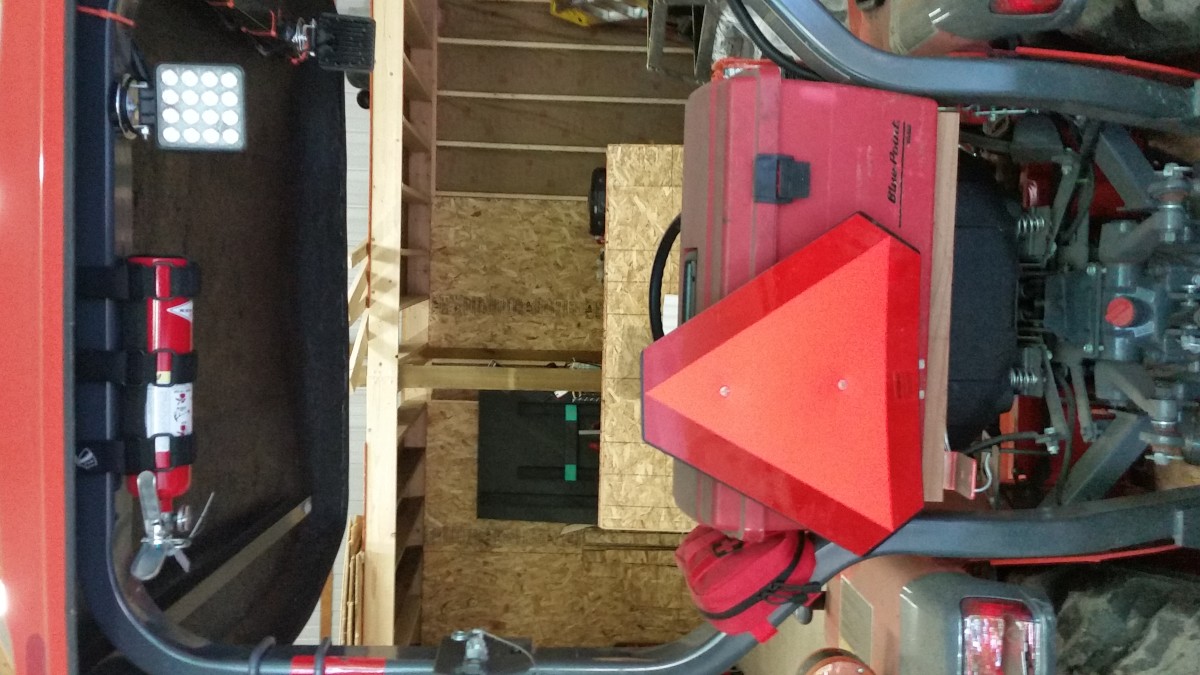 Scrap pile chainsaw, chain and tool holder. 5” square tube and 2x5” rectangle tube split. Bolt with spring for clamp. Doesn’t really need a clamp. Uses factory plastic blade guard which helps moving saw from shop, truck or worksite. Note adjustable rubber foot to add support for the saw. 1/2 plate on bottom. Welded to loader upright. Can safely carry chain, saw or tools on tractor.