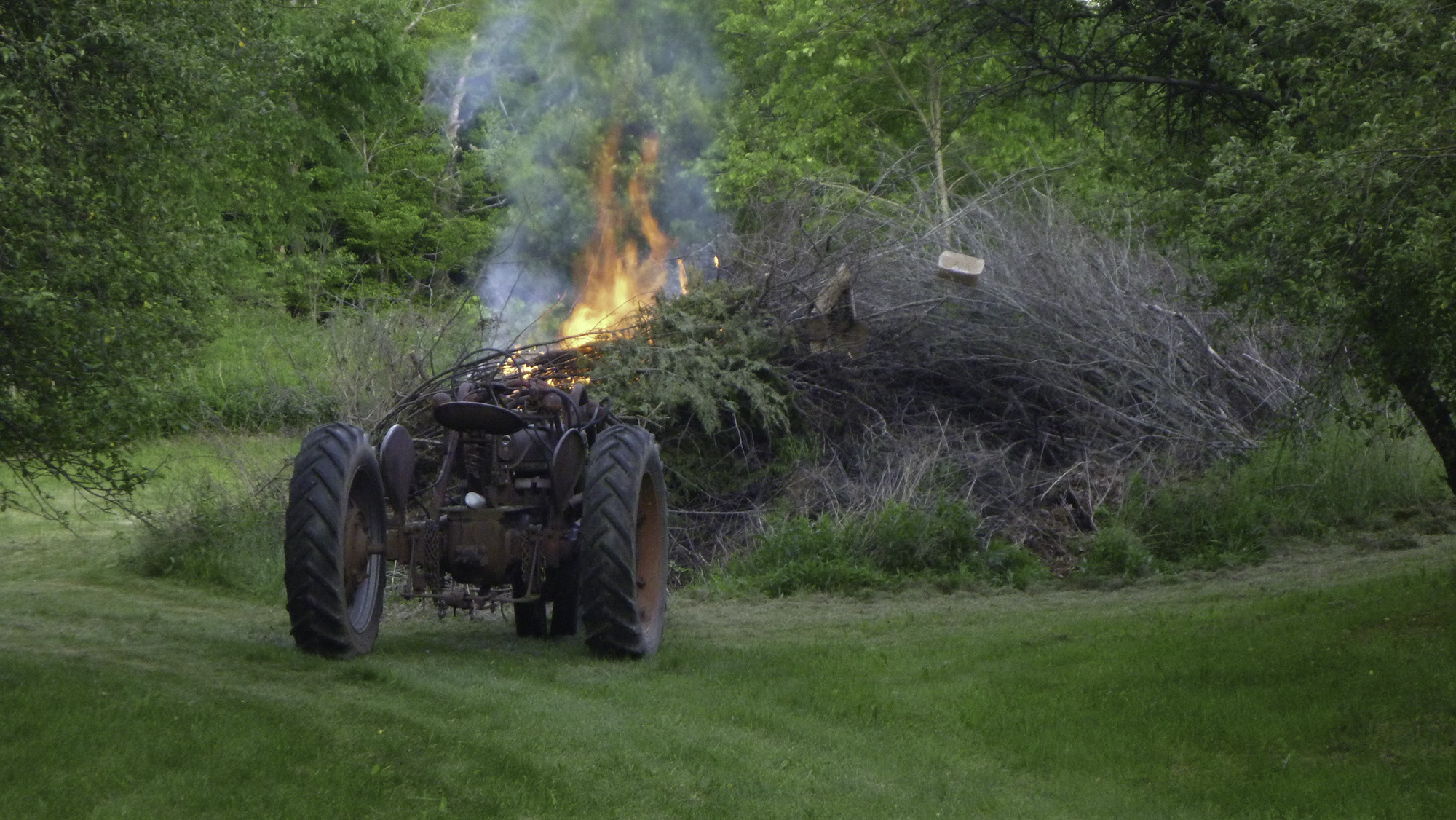 Reminds me the day I got my bran spanking new kubota and was pushing brush into a good size pile burning. Well she stalled with the bucket and two front tires in the fire, I has seconds to decide - try to restart, or jump off the back. I went for the restart, and she started and I sped out of there. One hour old tractor with melted front grill, lights and charred fenders.