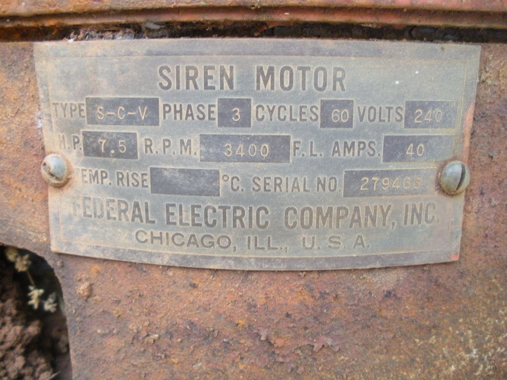 The siren has a tag on it, Federal Electric Company, Model S-C-V. 7.5 amp 240V. It is marked as 3-phase, but to my knowledge our station never had 3-phase power.