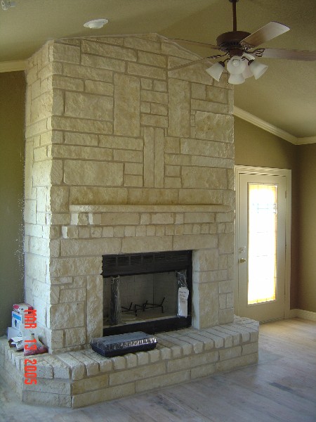 The fireplace in the photo is a "Majestic" insert. It has a fan and "fresh air "capabilities, also gas lighter capabilities. Ours wasn't hooked up for fresh air, but yours will need to be if you want glass doors. Our fireplace is real stone, but they make a lightweight veneer in all sorts of styles (do a search for texas stone veneer)and it won't require any kind of footing or additional concrete work. The veneer you can do yourself. It goes onto a metal lath over plywood and you use a grout bag to fill the joints. There are also "dry stack" veneers that require no grout.