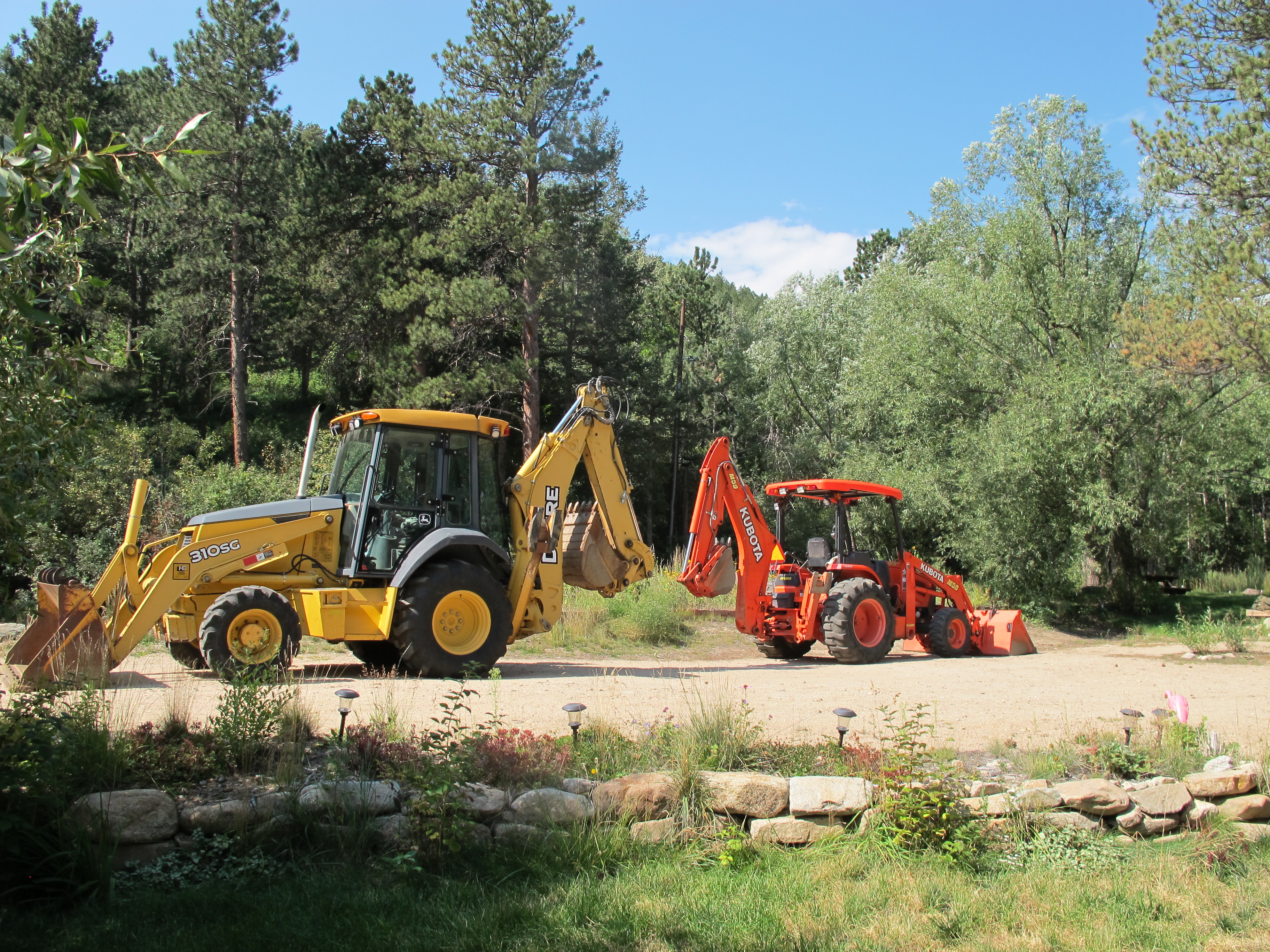 A flood wiped us out in 2013. As part of the rebuild we bought an older construction backhoe - a typical JD310G - to work alongside our M59. It is often used as a dumptruck, in the creek, or for really heavy rocks. No thumb :-(