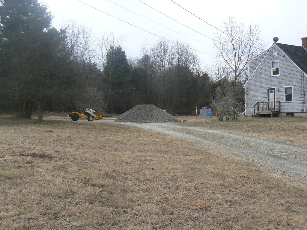 My first project (involving my tractor) of this year was some much needed driveway repairs. I had 15 tons of 3/4 crushed stone delivered this morning and got to work. Took about 1 hour to spread it around, then another hour of leveling and such. A few pictures attached to show the job.