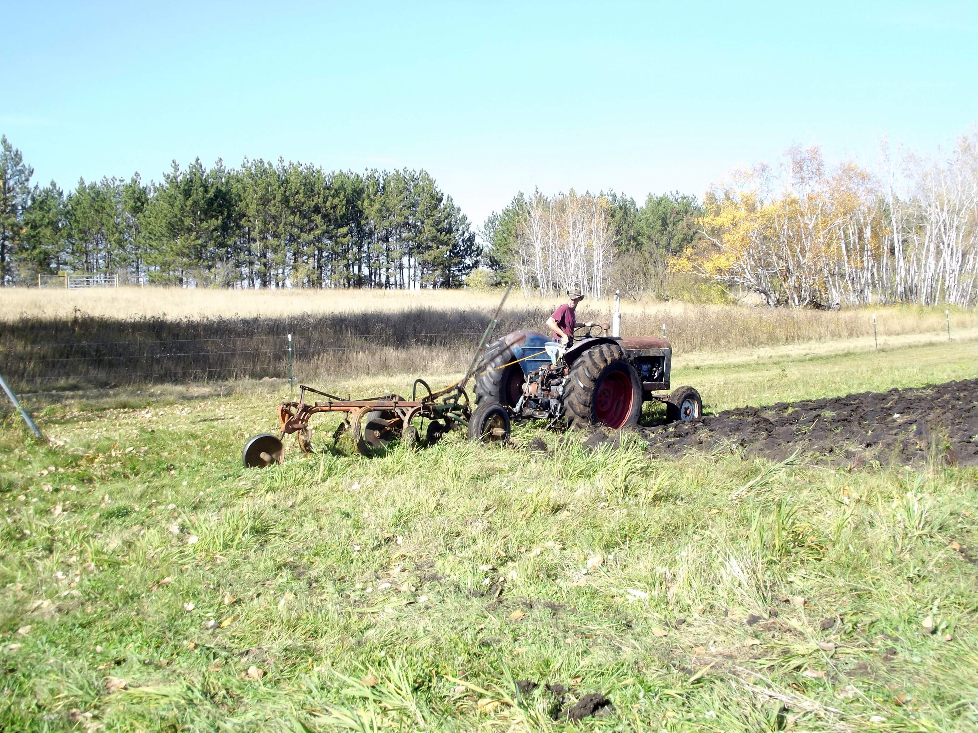 It was a beautiful, sunny fall day on Minnesota Hill. What does that mean? It's a good day to burn some vacation time and do some plowing. Now mind you, I've never plowed before, and the plow is an ancient Case three-bottom trip plow that I pulled out of the weeds, put some new tires on, and spruced up a little. It's been sitting on the hillside for well over thirty years, so things were a bit stiff. Nothing a bit of oil, grease and wire brushing can't fix. As for the needed adjustments, I looked all over this site, as well as other online resources to see how everything should line up. My dad and brother showed up to lend help and advice and we proceeded to mark the field, adjust the plow to the tractor and start plowing.