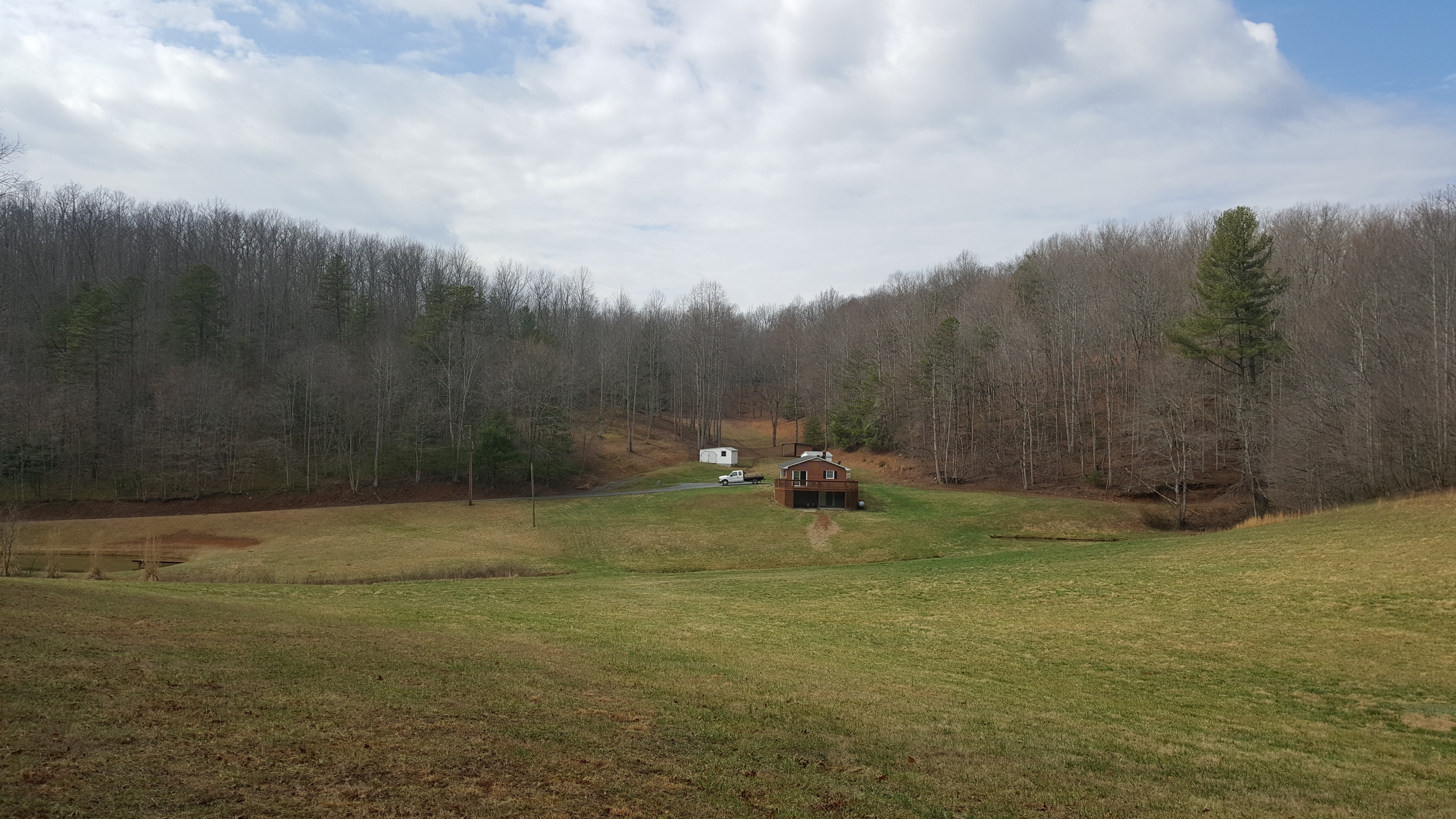 The house sits in a "bowl" (taller terrain to east/north/west and has 3 spring fed ponds. Aside from about 10% field grass around the ponds, the balance is moderately wooded and