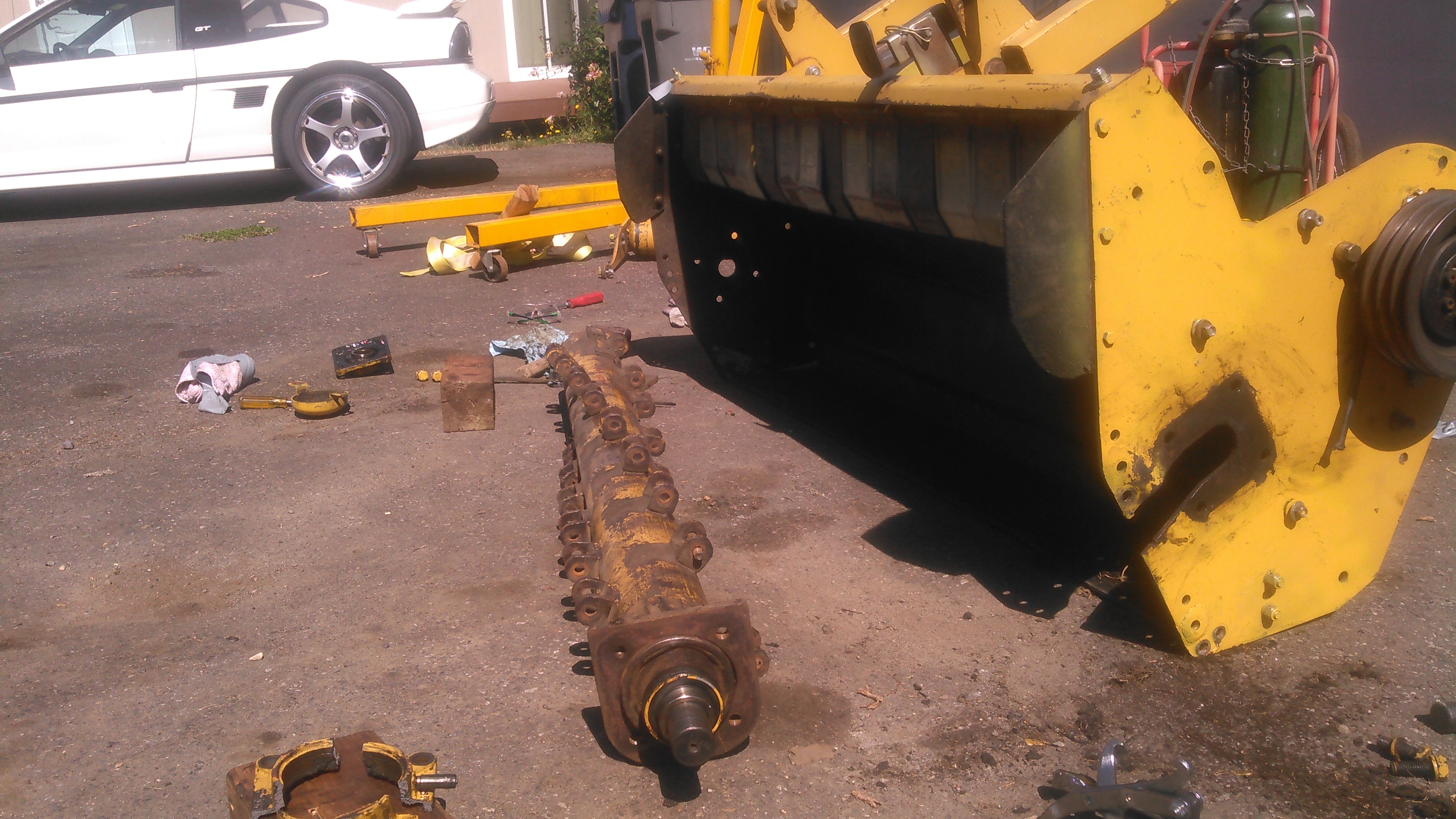 When i got the extra clearance from removing the bearing support, which ideally would have came off in one piece with the bearing, i was able to lower the drive side down the slot. Even though it didn't look like it was going to have enough 'wiggle room' on the opposite side, the rotor dropped low enough on the slotted side to clear the flail frame and pull free. NOW i am desperately hoping i can find a replacement part....