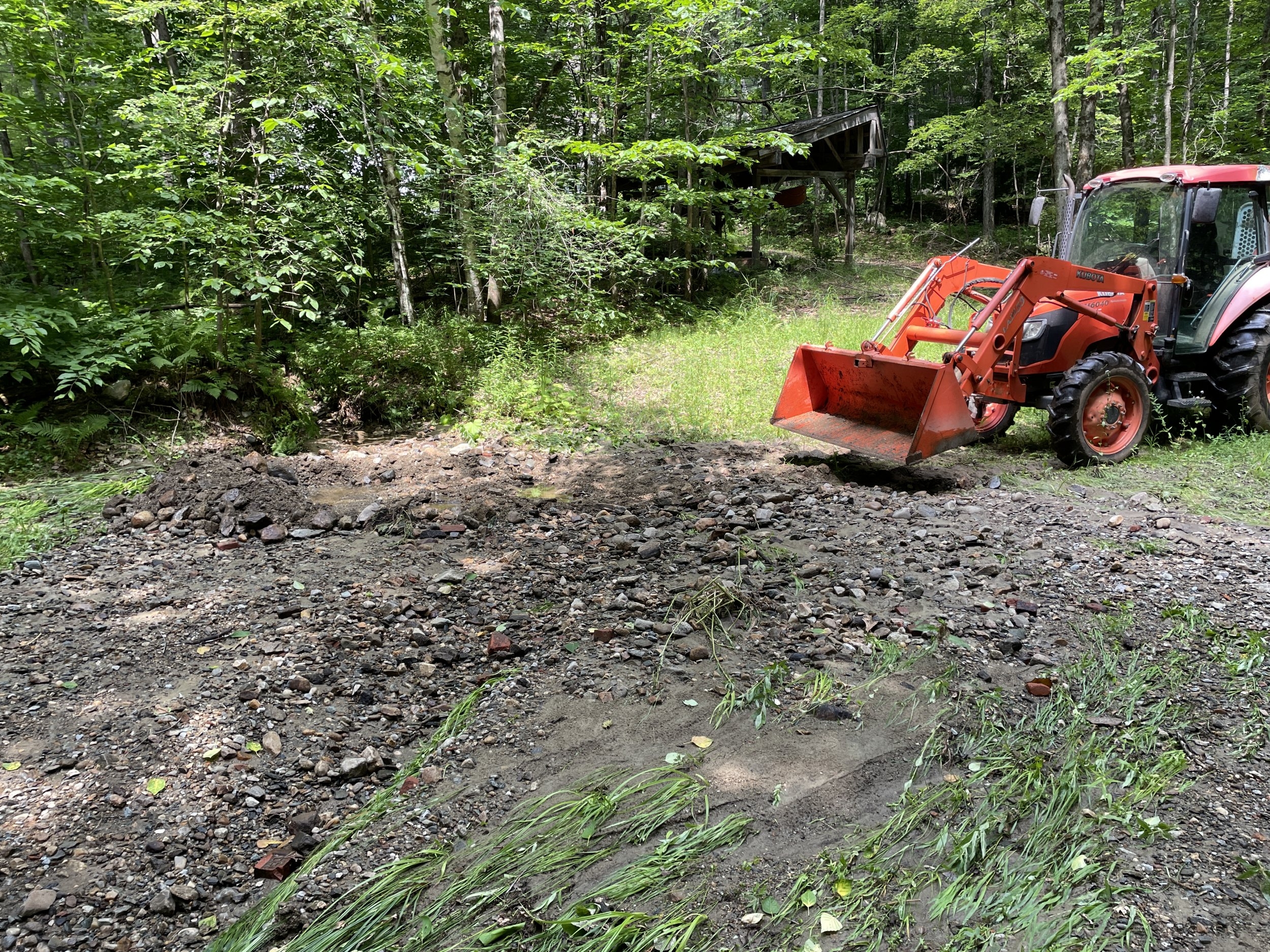 You may or may not know about the catastrophic flooding w've had here over the last few days but I got the chance to do some repair to my mothers driveway after the culvert plugged and washed out the road. Alot of the washed out gravel ended up in my pond, which is usually dry[don't ask]. So I hauled 8 bucket loads of the material and did a quick and dirty patch job so we can get a vehicle up to her house.