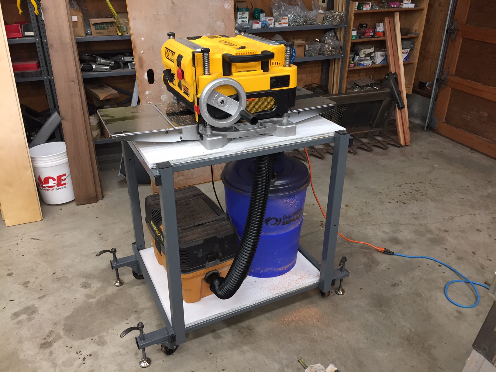 I have most everything on tool stands with wheels. I use a block of wood to wedge them off the floor when I need them to stay put. Recently there were some helpful posts on built-in floor stops. Making a tool stand for a thickness planer, which needs to be very stable, I decided to do something a bit fancier than a block of wood. These stops are easy to make and work well. There is a 1/2" nut welded on the bottom of the frame and a short bushing welded on the top. The three pieces (handle, threaded rod, floor mount) are assembled with blue Loctite. The mount rotates and tilts.