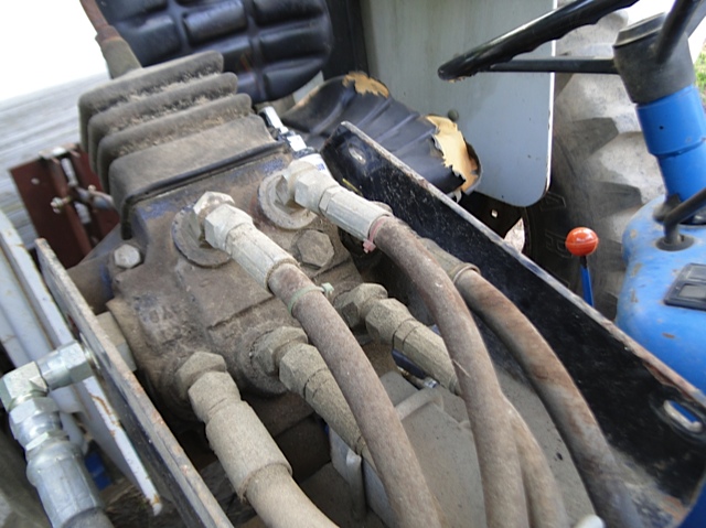 Two hoses leave the manifold. Looking at the picture above: the hose on the left, (which is the right side of the tractor from a driver's point of view), goes to the BYD plug on the FEL valve.
