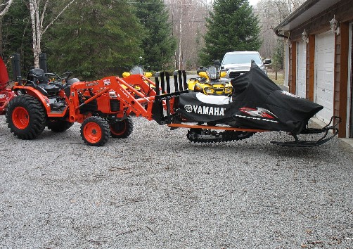 A very good friend of mine made me fork extensions. I did a post a short time ago and got some good feedback. I wanted to use them to move my snowmobiles around. I have a Kubota B2630 with pallet forks. I found that I don't have enough lift capacity to lift anything heavier then the snowmobile in the picture. I can't lift any higher then in the picture. I was hoping to lift the snowmobile into my pickup. I know the lift capacity is drastically reduced the further forward the balance point is. Is there anyway for me to increase my lift capacity? (bypass valve pressure) I just need a slight increase.