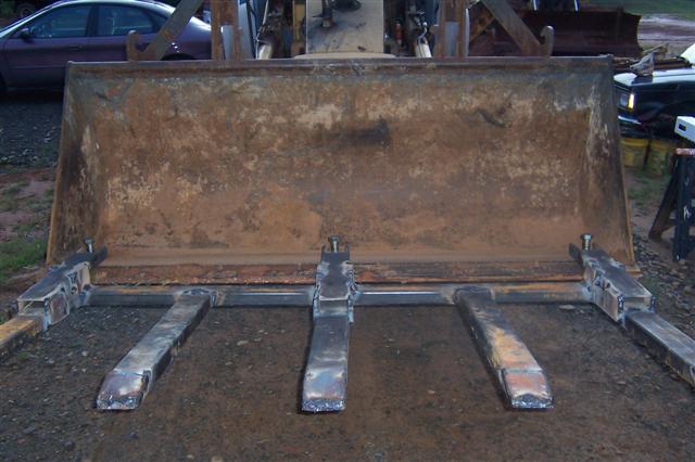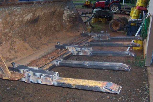 They look good Eddie. Definately much more robust than mine, which are really only for lifting and carrying building materials. Yours look capable of some serious combat. Does the front cutting edge of the bucket wedge tightly between the the top and bottom bars, or is all the weight on the bolts? Perhaps some extra metal to fill the gap would give added support to the forks and take some pressure off the bolts.