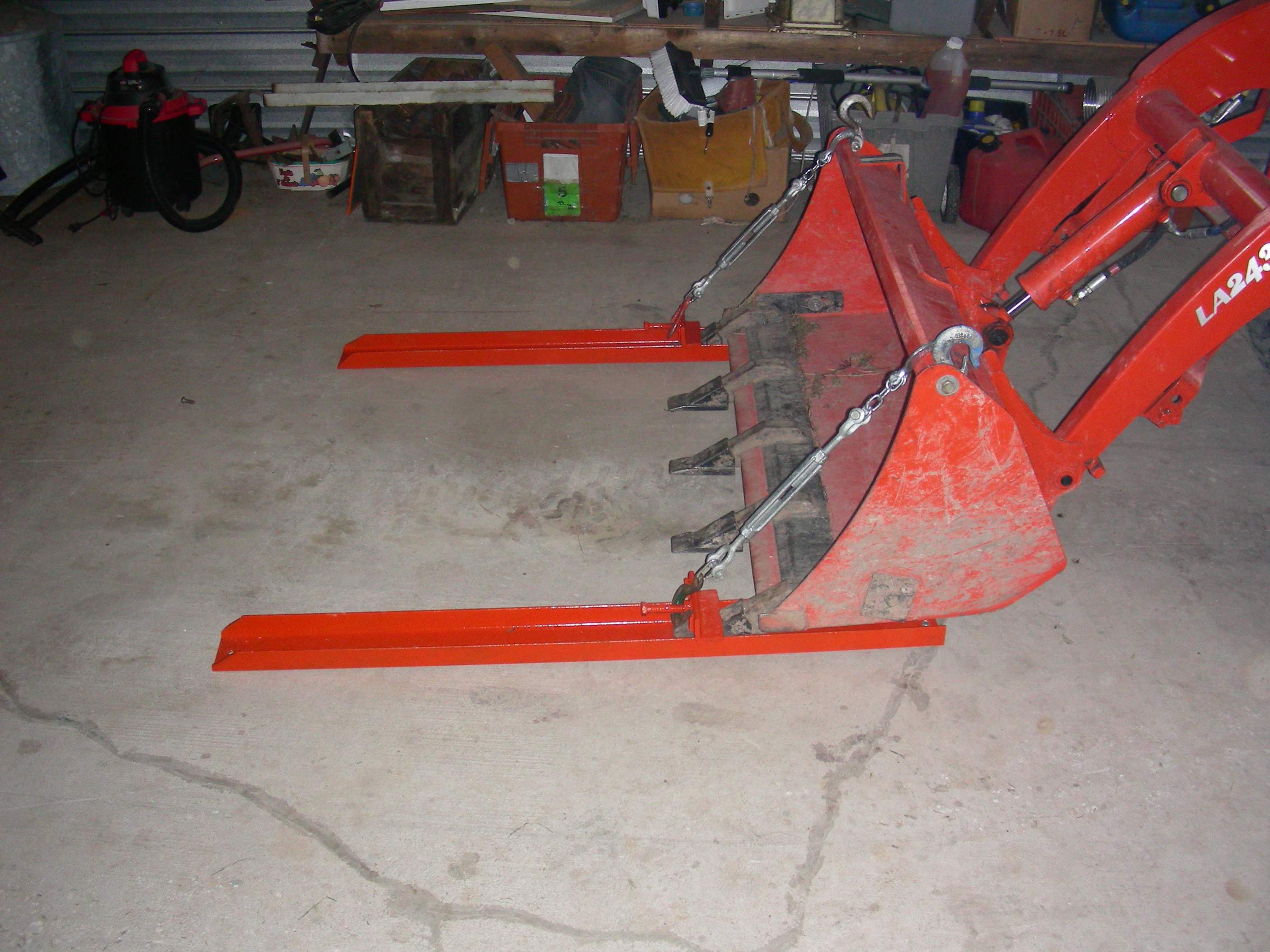 I also ended up making a general purpose box for carrying with some plywood , to triple the amount of wood I can carry in the bucket and can lift it the 6 ft high I need to get it near back door of house. I can take box and forks off by just undoing turnbuckles and tilting bucket to back out of it and leave it at my equipment staging area . All and all I am pleased with outcome. Total cost with free scrap steel was only the wood and orange paint and turnbuckles so $90 .