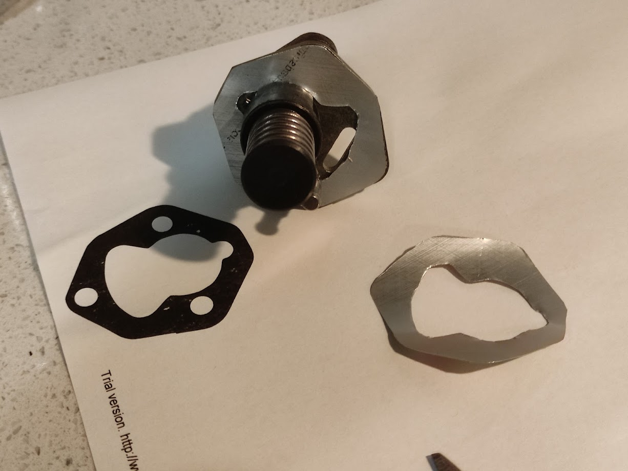 I've used a laser printer for transfer, using gasket material compresses over time when used in loose fitting so I used a Pepsi/Merinda/7up can, these happen to be 0.1mm exact +/-0.01mm, other sodas and beer cans vary, anyways I simply ironed the paper print on to the surface for cutting reference. The rest were cut on top of the first cut using a sharpie. Cut the metal on a notepad or thick carton for ease. Holes were drilled on top of a scrap wood while attached to the pump for clean finish prior assembly, I don't have a hole puncher set. I live @~1KM altitude which requires advancing the timing, and I confirm as 90cummins mentioned each fuel pump is different, and the cam follower is sacrificial which changes timing slightly on wear.